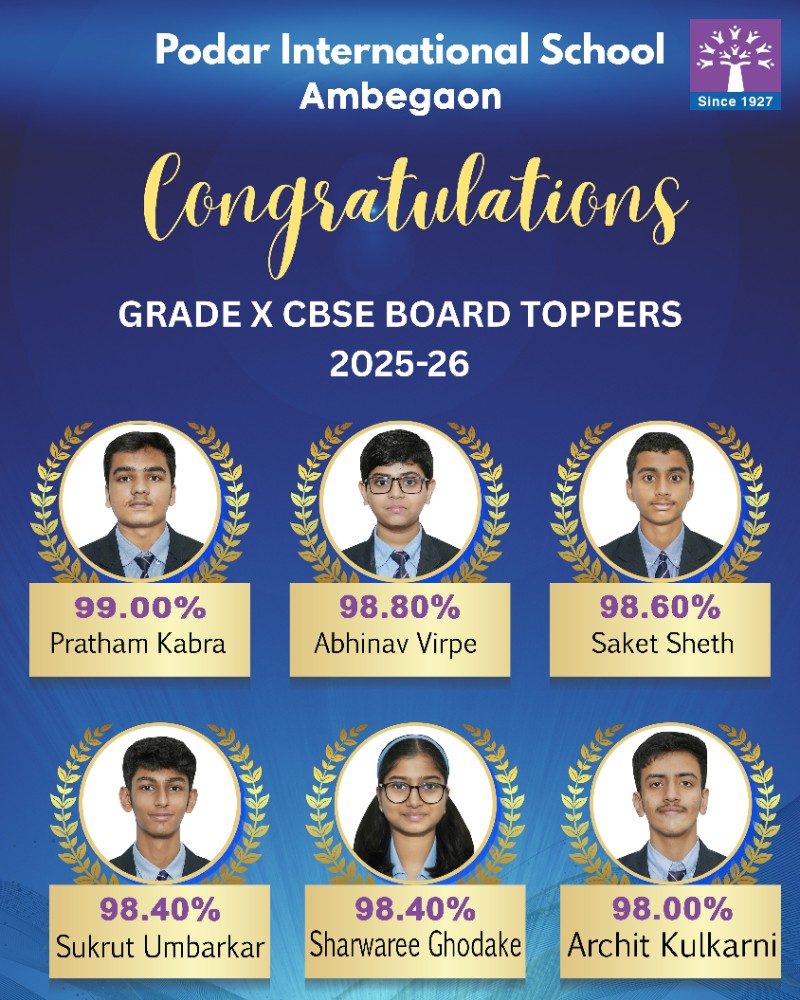 Podar International School Ambegaon celebrates the outstanding success of its students in the CBSE Grade 10 Board Exams 2025–2026.