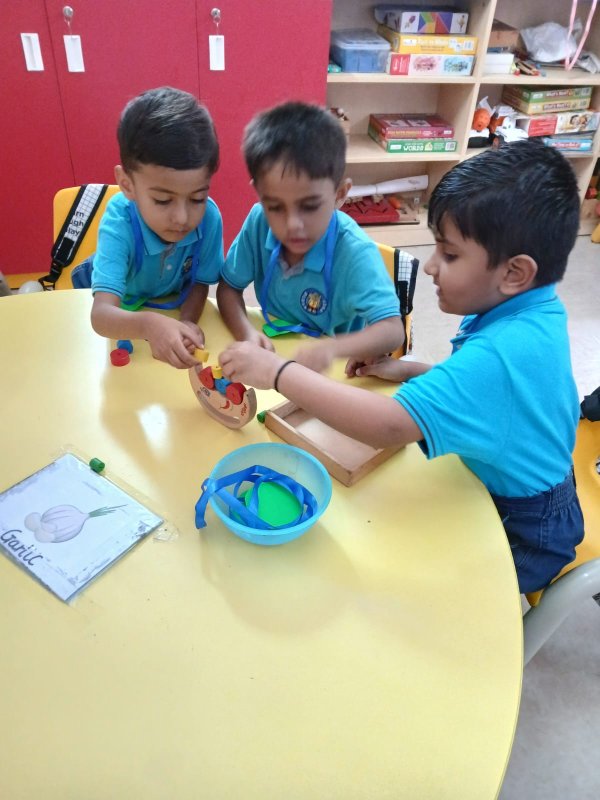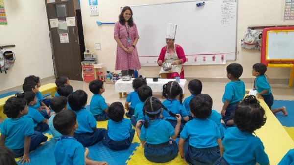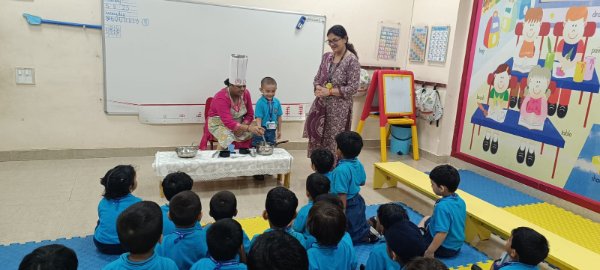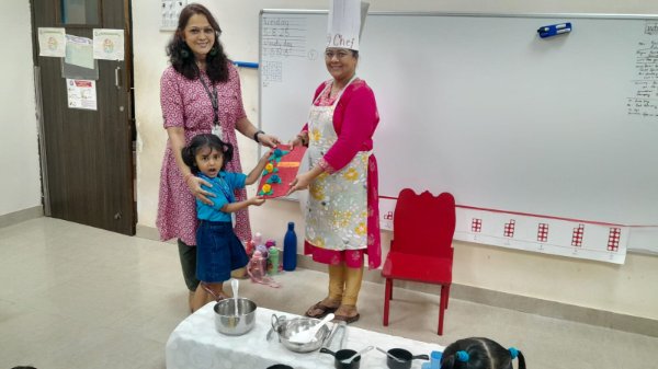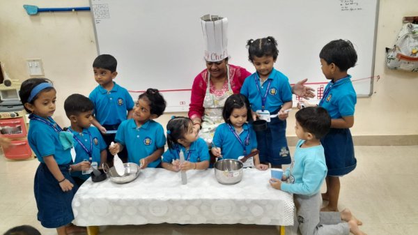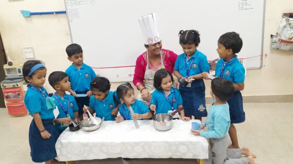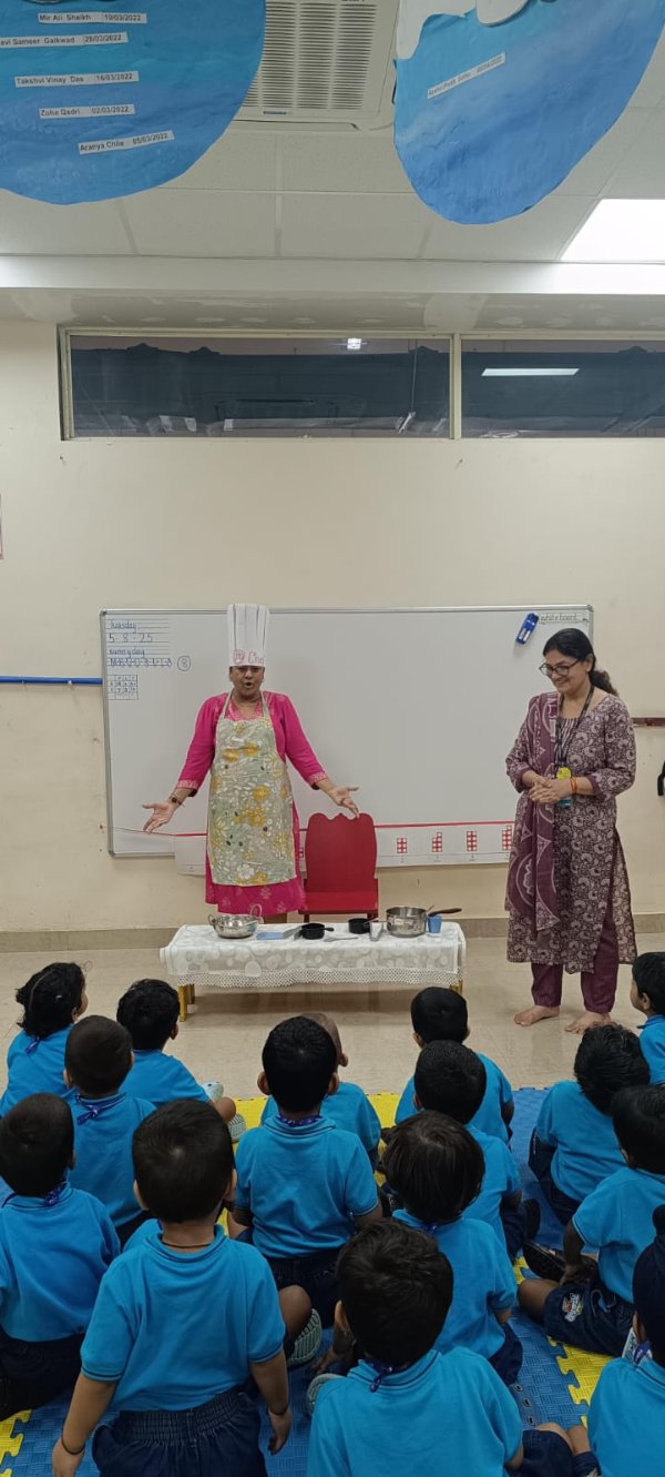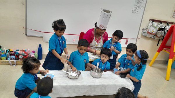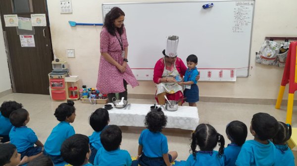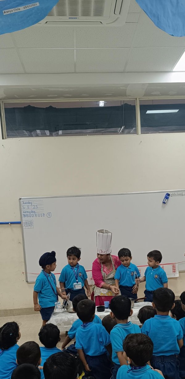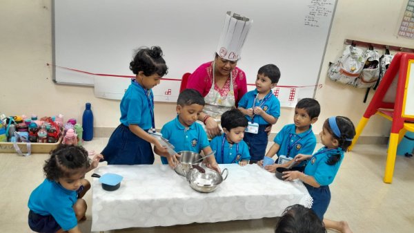 Our Nursery children learnt about different activities of kitchen like chop, strain, boil, stir, mix, cut. These activities will help children develop skills and confidence with hands-on cooking activities. As they read and follow recipes, they become independent and self-directed.