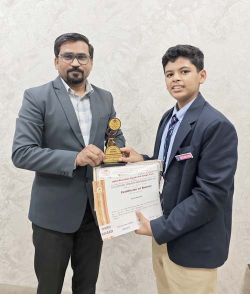 Master Arshit Bhujade, a student of Grade 8, secured the Third Award at the National Level Drama Competition – All India Multilingual Drama, Dance, and Music Contest Fest 2025, organized by the 21st Cultural Forum of Performing Arts and Akhil Bhartiya Sanskrutik Sangh, Pune. He is now selected to represent India at the International Stage in Thailand!
