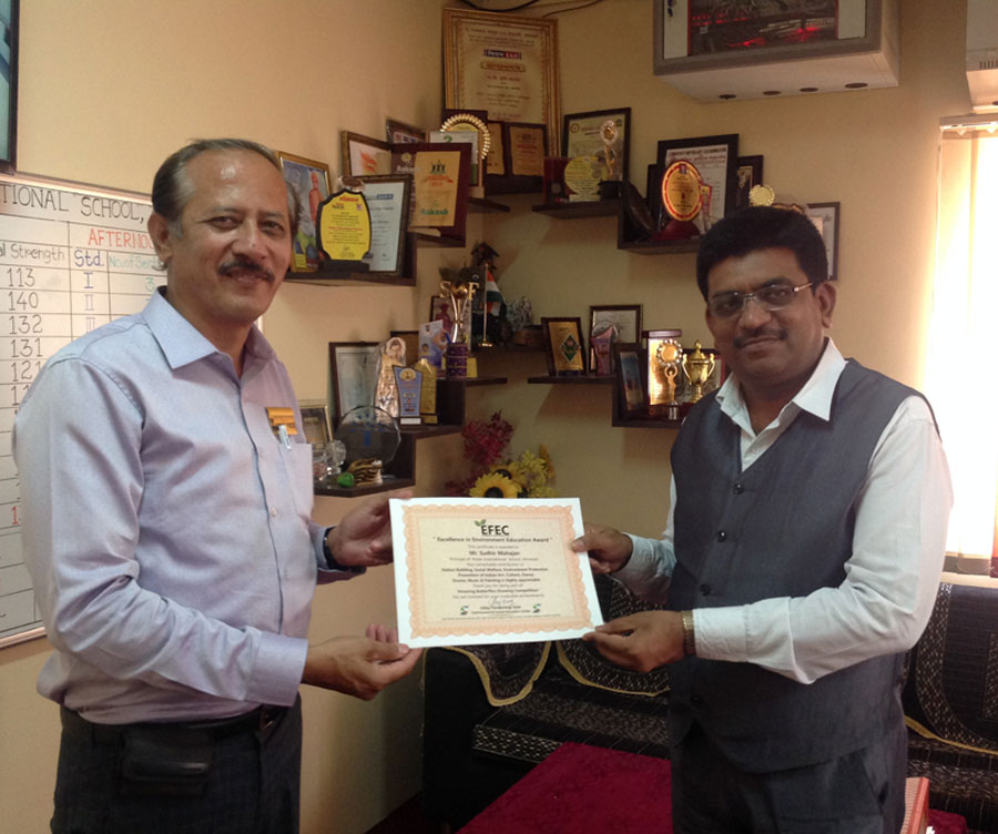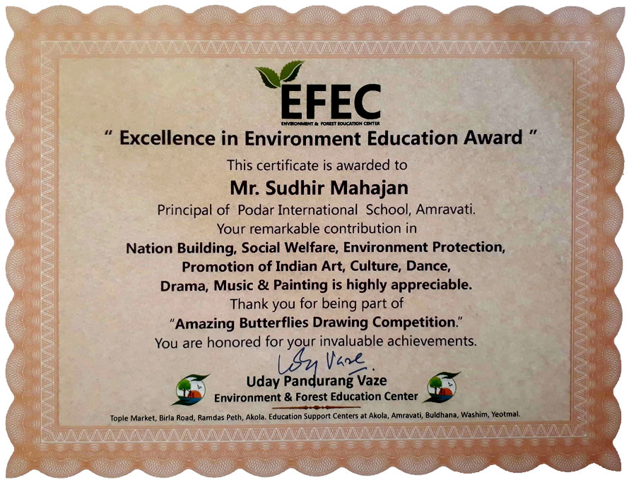 Environment and Forest Education Centre (EFEC) honoured principal sir Mr. Sudhir Mahajan with "Excellence in Environment Education Award" to work in the field of Environment protection, Nation building and Social welfare.