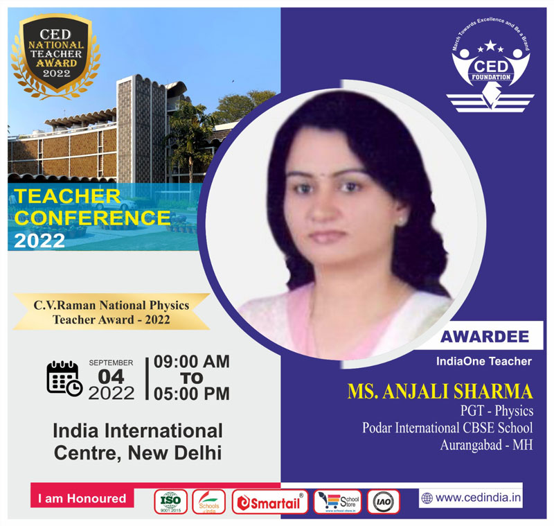 It is indeed a great honor and pride for Podar International School CBSE, Aurangabad to proclaim that C.V.RAMAN NATIONAL PHYSICS TEACHER 2022 AWARD has been conferred upon our teacher Mrs. Anjali Sharma. She will receive her award at the felicitation Ceremony in India International Centre, New Delhi on 4th September 2022.