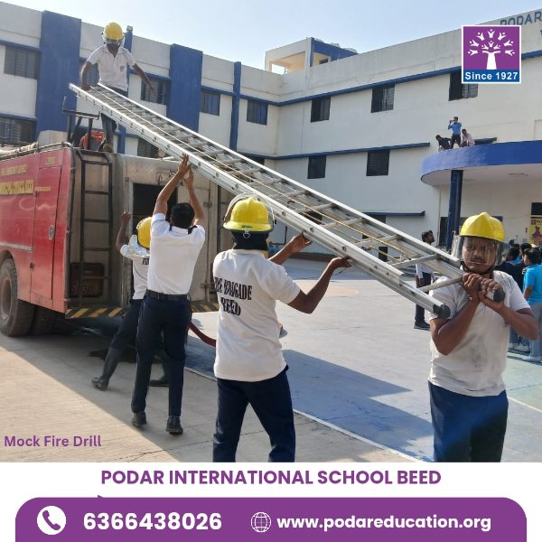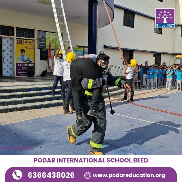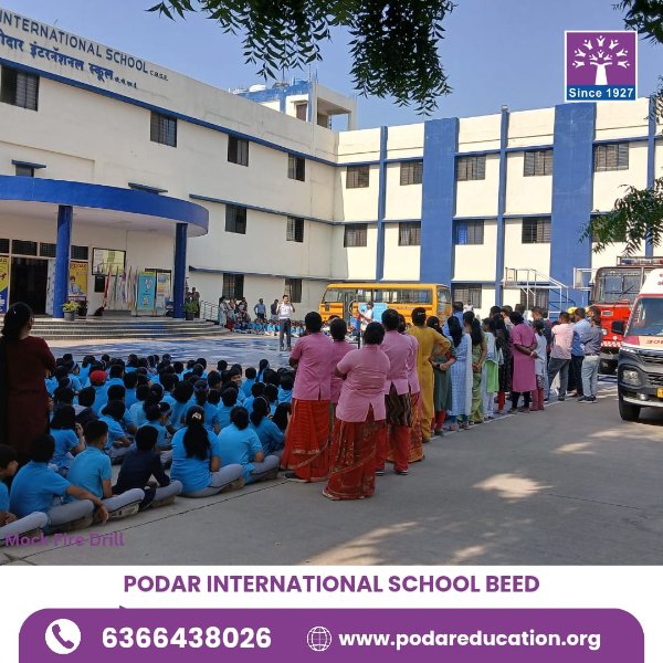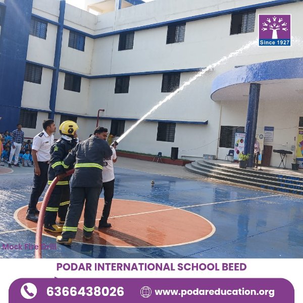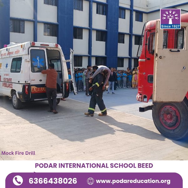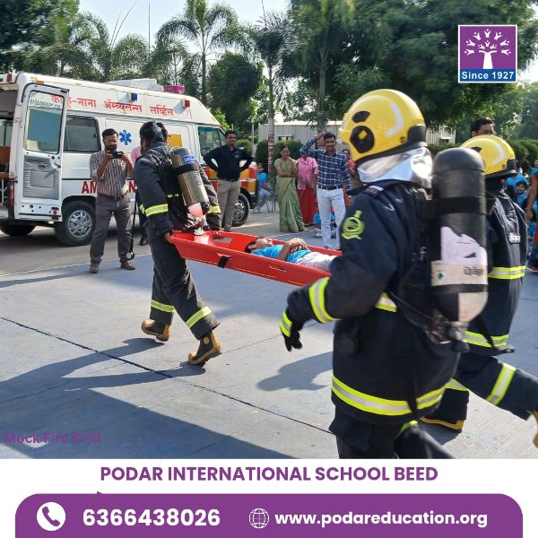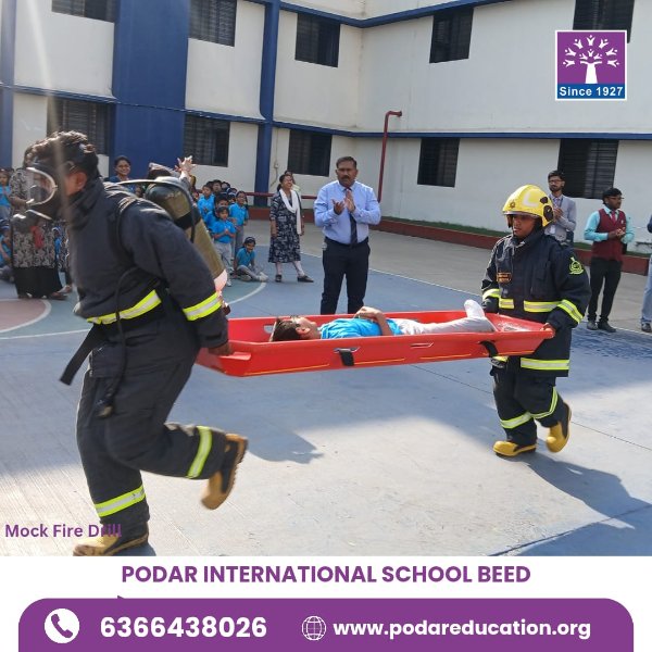 Podar International School, Beed, organized a mock fire drill today in collaboration with the Beed Fire Brigade to instill awareness and self-protection skills among students during emergencies. This initiative provided students with hands-on training on how to safeguard themselves during natural disasters or sudden emergency situations.