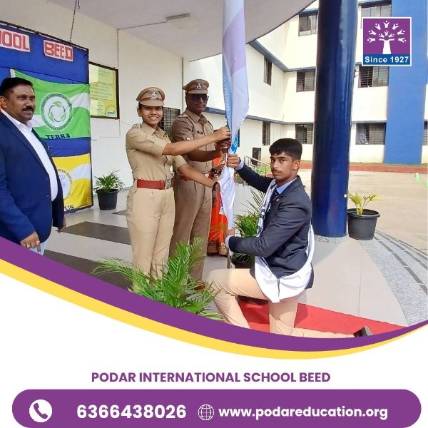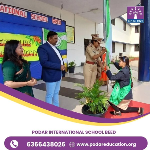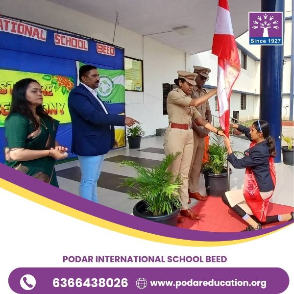 Podar International School, Beed, commemorated the 75th Republic Day with immense enthusiasm and pride, embracing the theme "Bharat – The Mother of Democracy." The celebrations began with the hoisting of the national flag, followed by inspiring addresses from the Chief Guest, Mr. Dnyaneshwaar Kadule (Army Officer), the Principal, Mr. Ganesh Kakde, and the Vice Principal, Ms. Varsha Nagde.