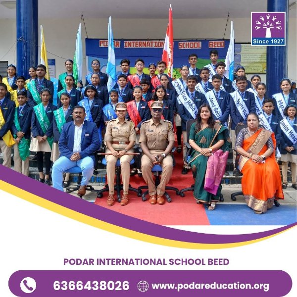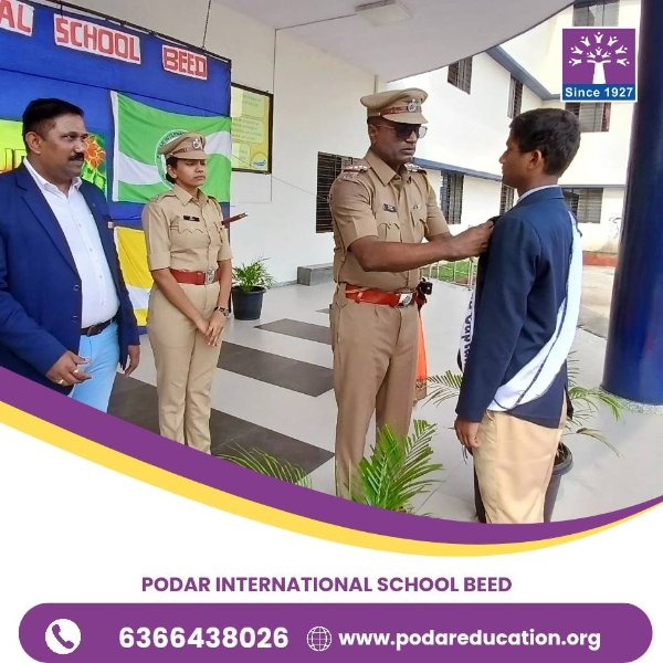 Podar International School, Beed, held its Investiture Ceremony with pride and enthusiasm during a special assembly. The event was graced by Ms. Pooja Pawar, Deputy Superintendent of Police, and Mr. Shital Kumar Ballad, Police Inspector, Beed, and was attended by proud parents and students.