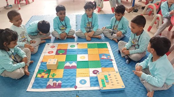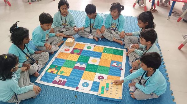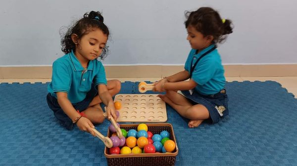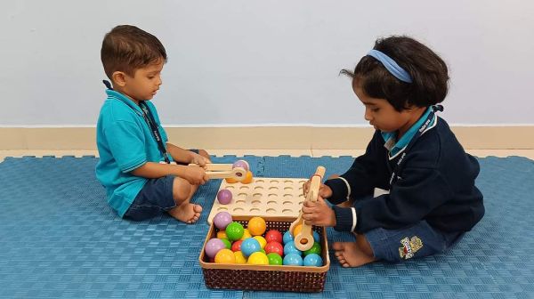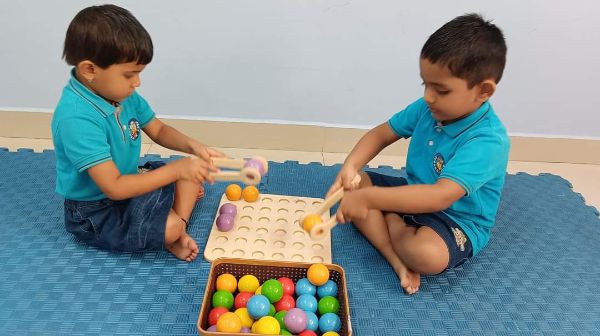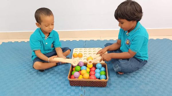 Learners sorted orange and purple wooden balls, placing them on the game board vertically or horizontally using two hands and tongs. It's a hands-on experience that nurtures their fine motor skills and enhances their understanding of patterns and sequences. Through this activity, they develop coding skills, as patterns lay the foundation for logical thinking.
