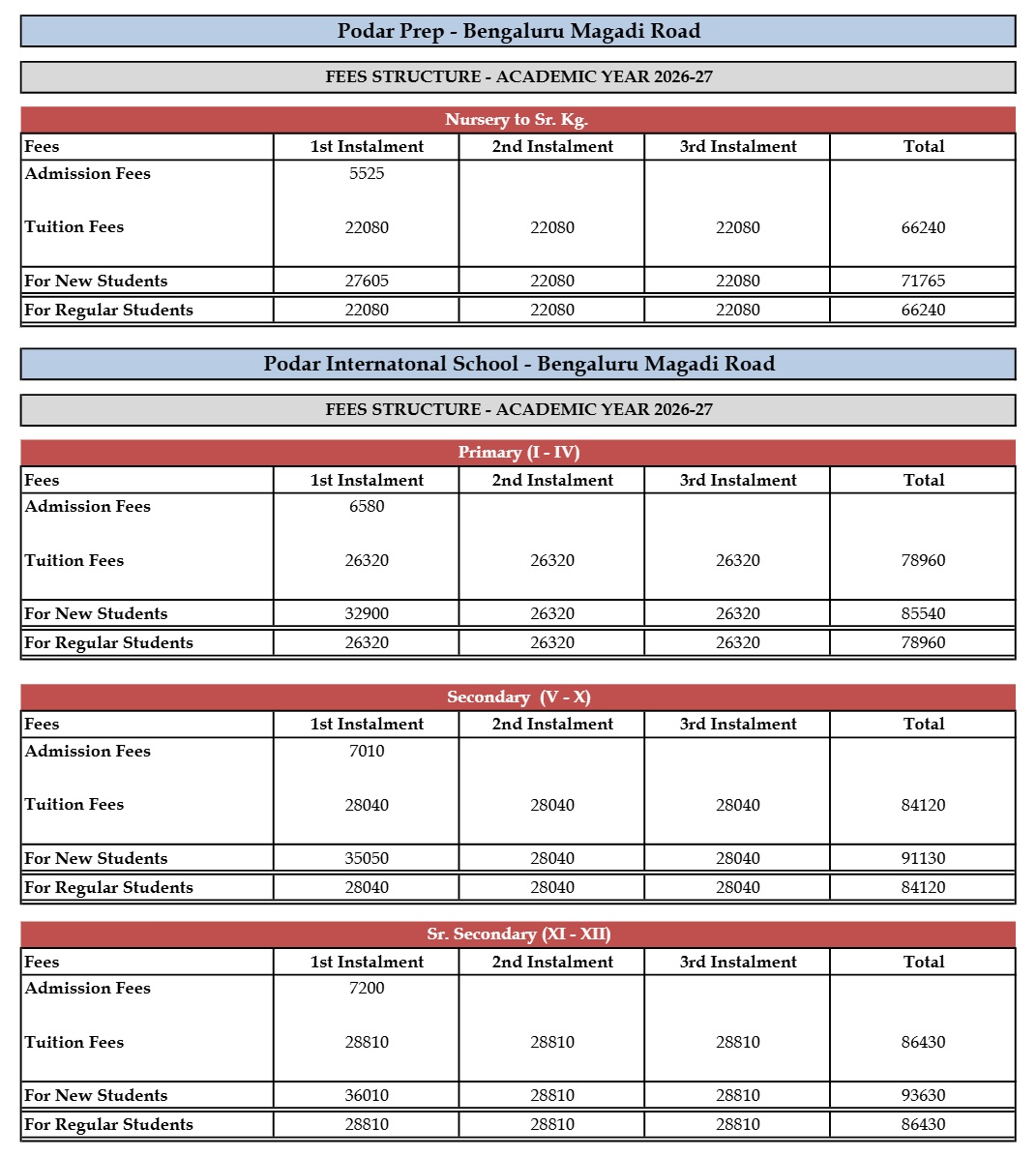 Podar International School Fee Structure in Magadi Road, Bengaluru