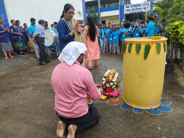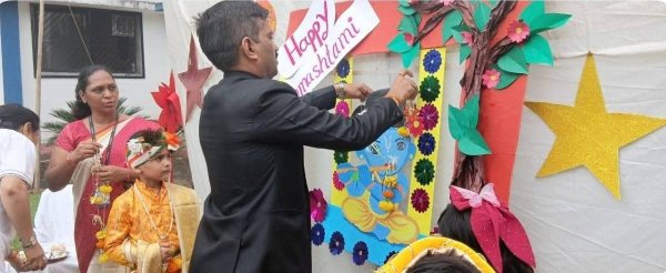 The Ganesh Sthapana ceremony was performed by our dearest principal Mukund Ingle sir and Mrs. Ingle ma'am with utmost reverence, filling the atmosphere with chants, prayers, and positivity. Students, teachers, and staff joined hands in decorating the school with rangolis, flowers, and eco-friendly decorations, symbolizing purity, creativity, and respect for nature. The joyous beats of dhol, the smiles of children, and the fragrance of devotion created a spiritual aura that touched every heart.