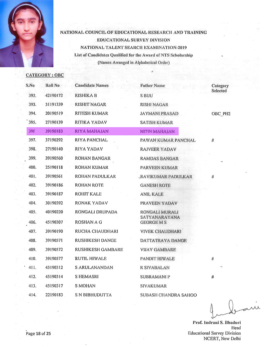 Riya Nitin Mahajan from our Podar International School, Bhusawal has qualified second level of NTSE 2019 and is eligible to get NTS scholarship from MHRD Govt. of India for her further higher studies.