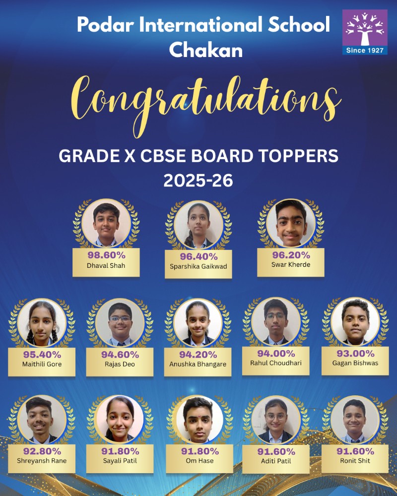 Podar International School Chakan, Khed celebrates the outstanding success of its students in the CBSE Grade 10 Board Exams 2025–2026.