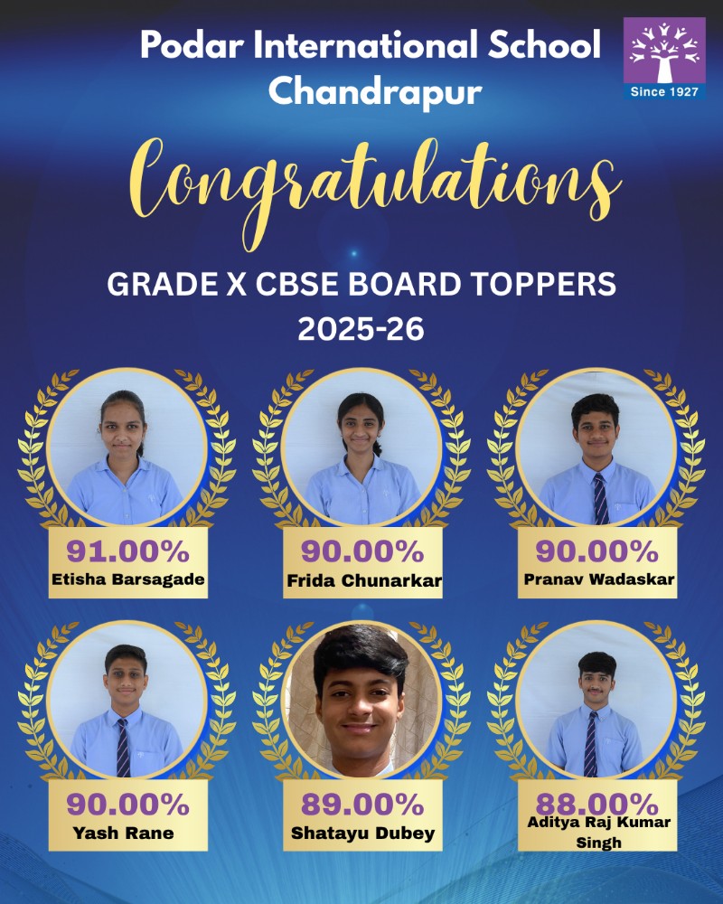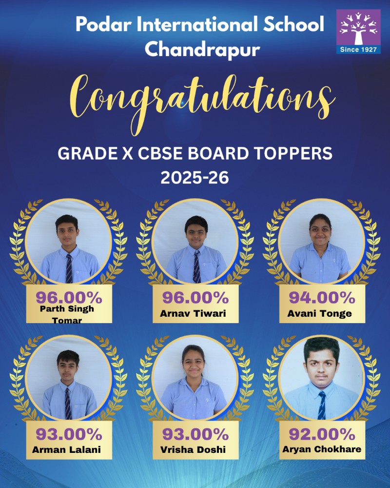 Podar International School Chandrapur celebrates the outstanding success of its students in the CBSE Grade 10 Board Exams 2025–2026.