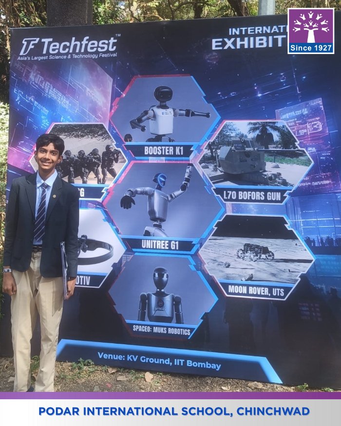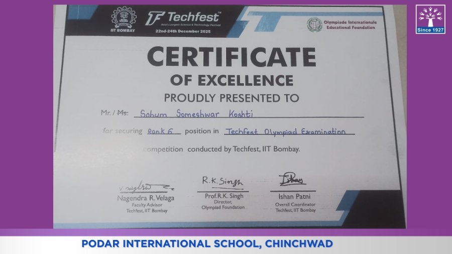 We are proud to share that Master Sohum Koshti, a student of Std X Podar International School, Chinchwad, has successfully cleared Round 2 (Written Examination) and Round 3 (Group Discussion) and was shortlisted among the Top 12 candidates during the Personal Interview round of IIT Techfest Olympiad held at IIT Bombay campus on 22nd and 23rd December 2025 respectively.