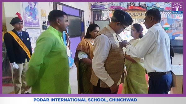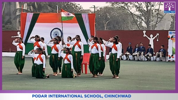 The 74th Republic Day was celebrated with pride and reverence at Podar International School Chinchwad. The ceremony began with the unfurling of the tricolor flag by Mr. Sangram Malkar, Police sub inspector (PSI) Wakad Pune , Principal Shehanaz Cottar.