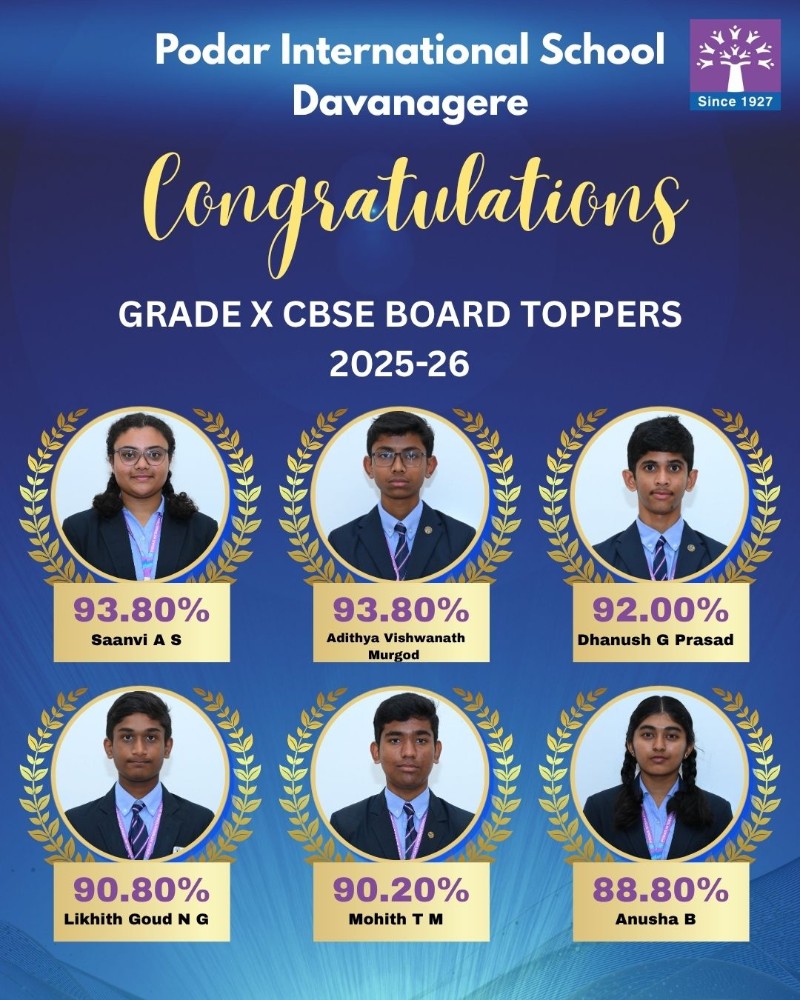Podar International School Davanagere celebrates the outstanding success of its students in the CBSE Grade 10 Board Exams 2025–2026.