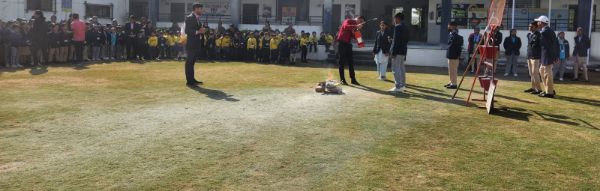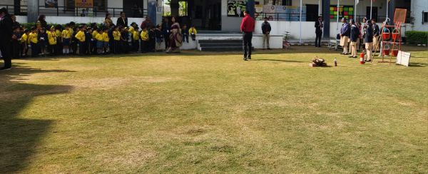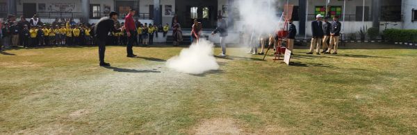 After the fire alarm alerted all the students were evacuated from their classrooms and asked to gather on the ground. Admin officer Mr. Gaurav Prasad explained all about the safety measures and he trained staff members and a few students on how to handle the fire extinguishers.