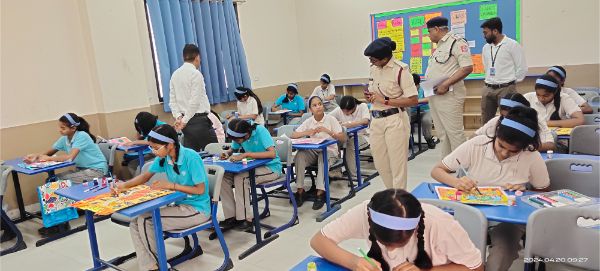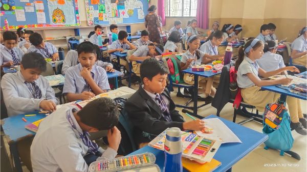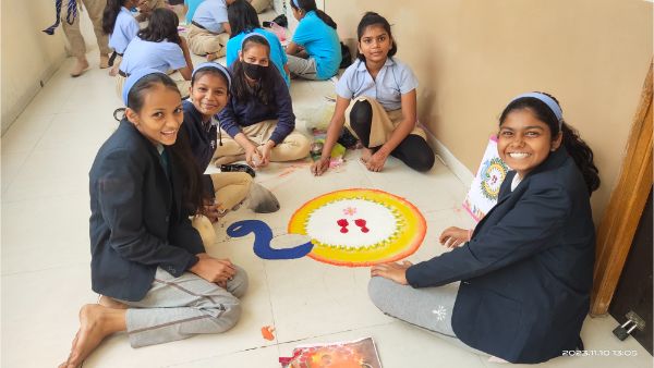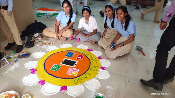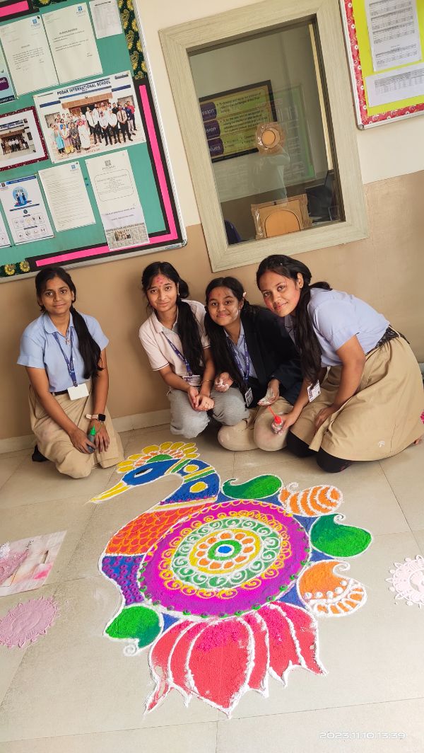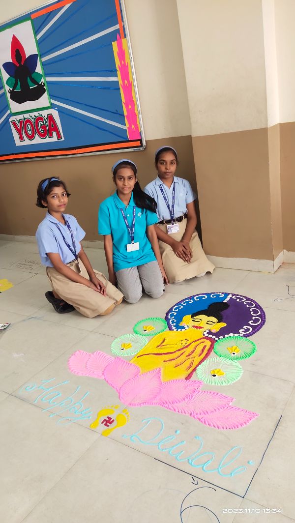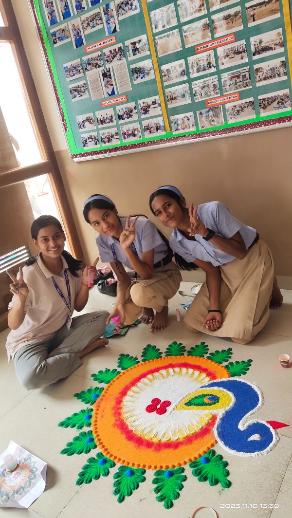 Students of different grades participated enthusiastically, creating vibrant and intricate Rangoli designs using coloured powders, flower petals, and other eco-friendly materials.