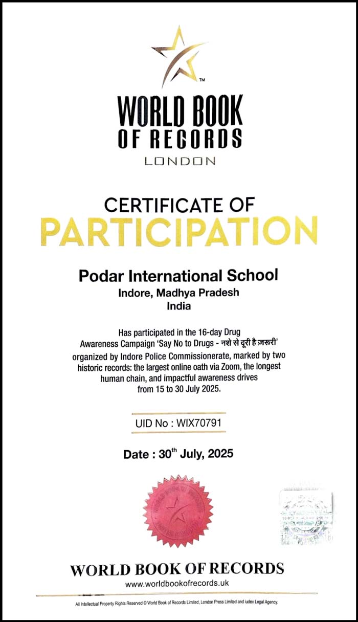Podar International School Indore received "CERTIFICATE OF PARTICIPATION - WORLD BOOK OF RECORDS LONDON" to take part in the awareness campaign 'Say No to Drugs' organized by Indore Police Commissionerate.