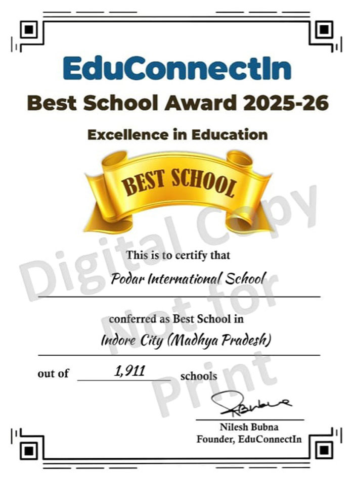 Podar International School, Indore has been awarded as *Best School Award 2025–26* for excellence in education, technology and parents feedback in Indore District by EduconnectIN organisation.