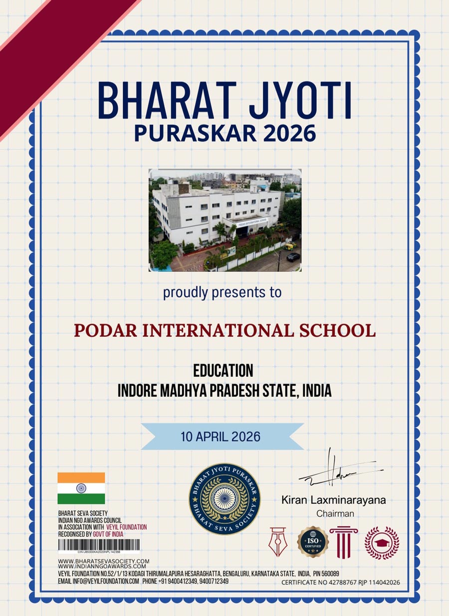 Podar International School Indore has been awarded the Bharat Jyoti Puraskar 2026 for Education