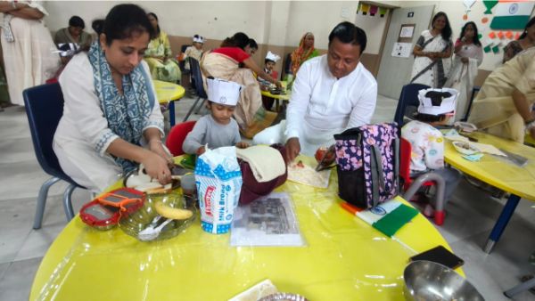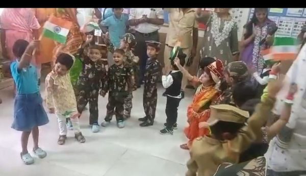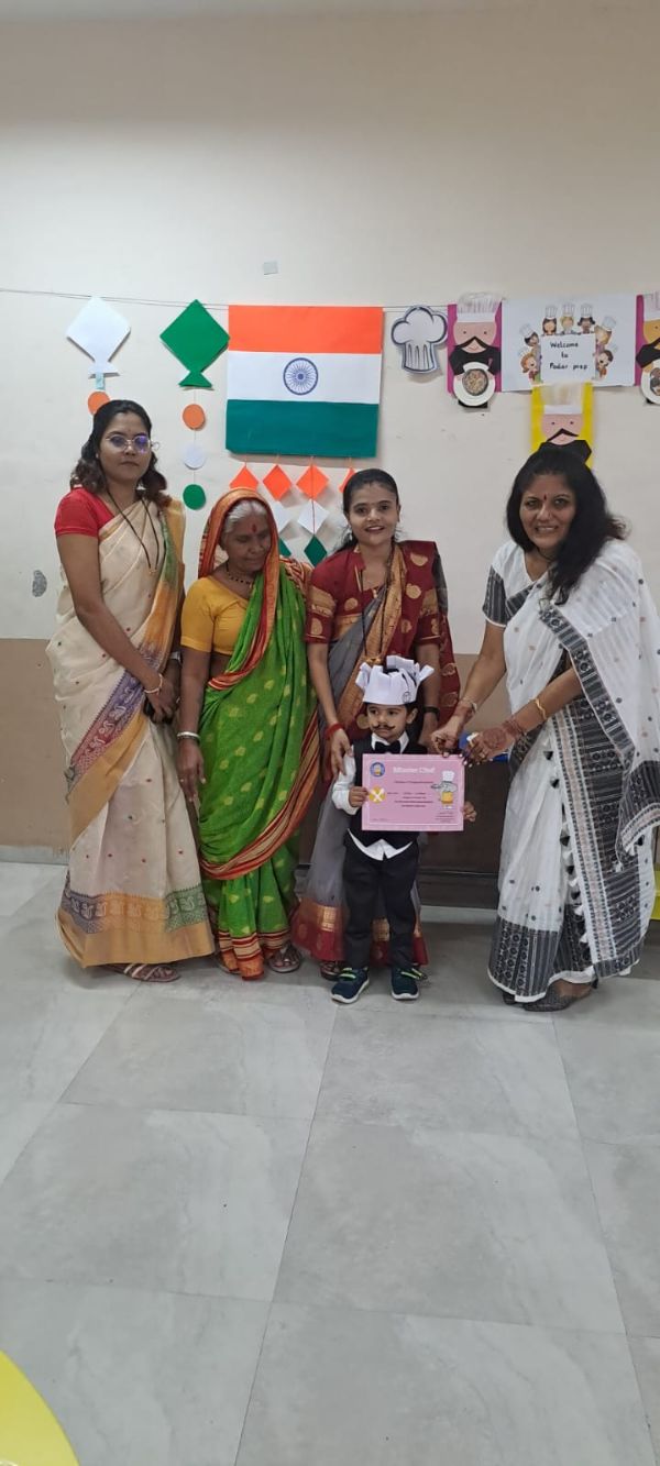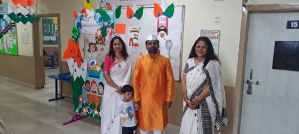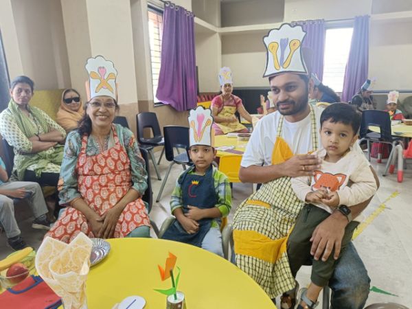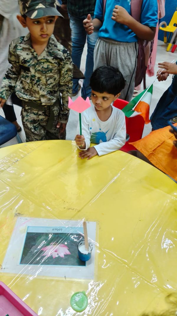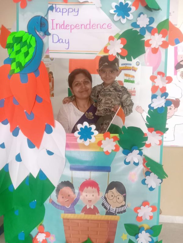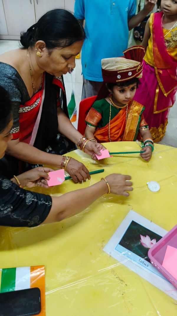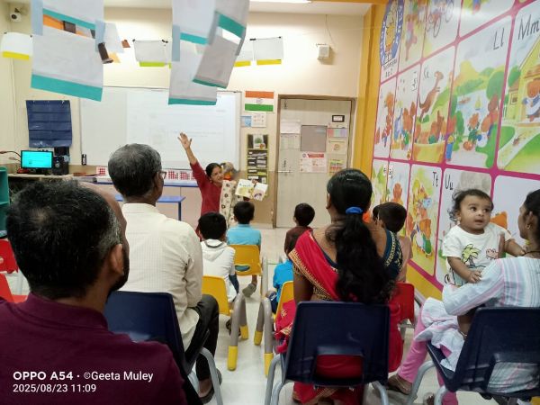 Grandparents and parents participated in various activities such as dancing, singing, a quiz, four corners, graffiti drawing related to India and Independence Day, magic tracing of coins, a memory game about freedom fighters, Go Vocal to Local, tri-color bookmark origami, Lotus origami, Indian musical instruments, a Good Art puzzle, an India map puzzle, and a ramp walk by kids.