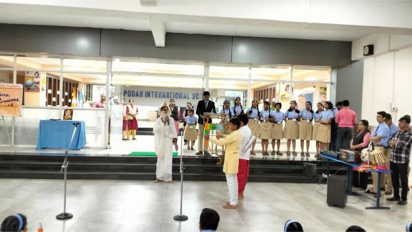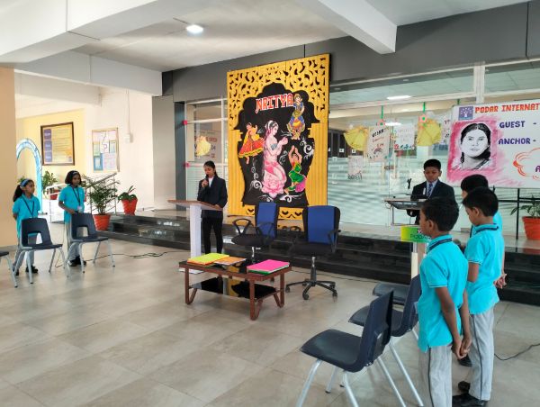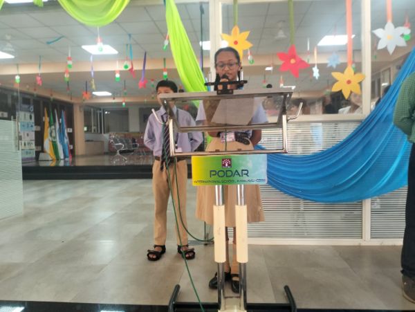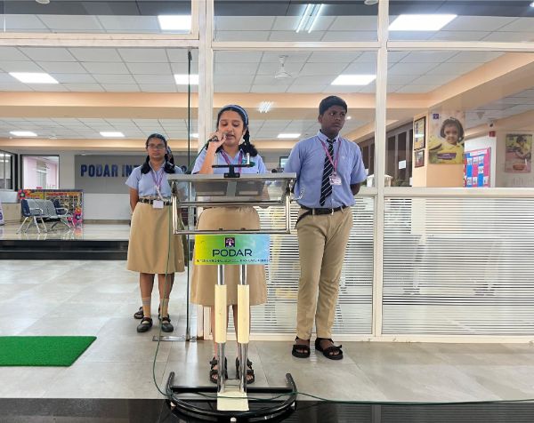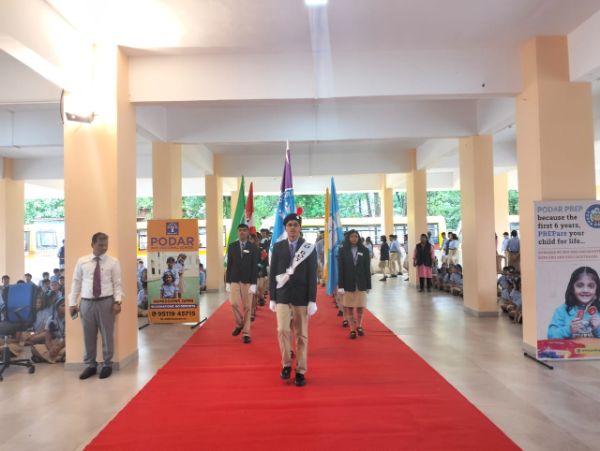 The program commenced with the Saraswati Stawan and Podar song, followed by a welcome song presented by the students. The highlight of the event was the awarding of badges and sashes to the newly elected School and House Portfolios, conducted by the Chief Guest, Principal, Coordinators, and House mentors.