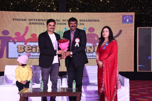 Podar International School, Khandwa celebrated its Annual Function on 20/12/2025 with great enthusiasm and pride under the guidance of our respected principal mam Ms Sameera Bakht. We were honored by the gracious presence of our Chief Guest Smt. Kanchan Mukesh Tanve, Guest of Honour Mr. Abhinav Barange, and Special Guest Mr. Rajeshwar Sharma, General Manager – Podar Education Network Group (MP Hub).