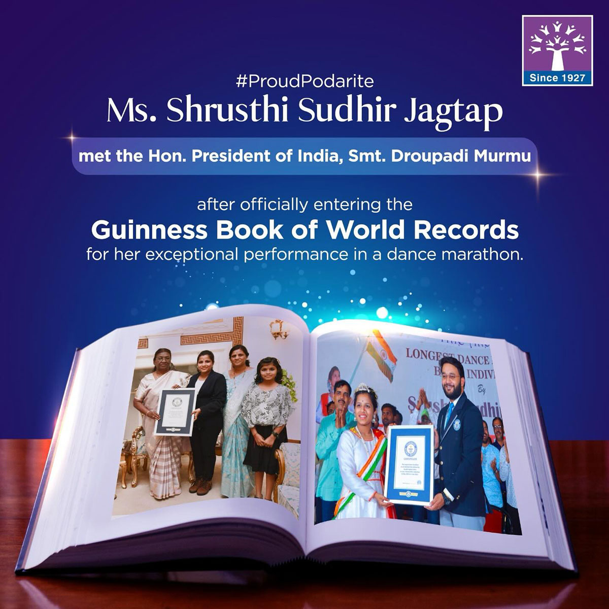 In recent news, Shrusthi Sudhir Jagtap, esteemed alumni of Podar International School, Latur, achieved a remarkable milestone by meeting the Hon. President of India, Smt. Droupadi Murmu. This extraordinary encounter was a celebration of her outstanding achievement, securing a place in the prestigious Guinness Book of World Records. Shrusthi's exceptional performance in a dance marathon captured the attention and accolades of many, marking her name in the annals of history.