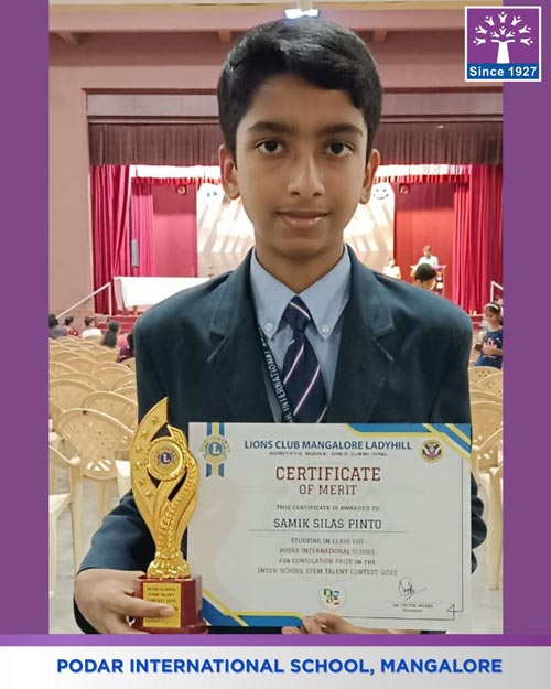 We are proud to share that Samik Silas Pinto of Grade 8, Podar International School, Mangalore, won a Consolation Prize in the STEM Talent Contest organized by Lions Club Mangalore Ladyhill at St Aloysius P.U. College, Mangalore.