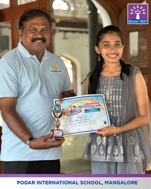 Podar International School, Mangalore, is proud to announce that Anagha Bhat secured 3rd place in the Classical Solo Dance category at the Chinnara Chilipili Children’s Festival organized by the Rotary Club Mangalore Seaside.