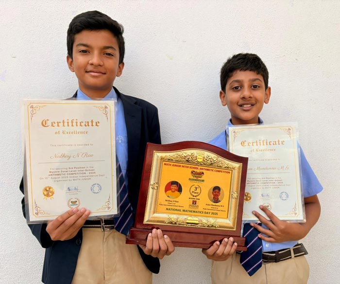 Mst. Nirbhay N. Rao and Mst Arjun Mandanna secured Third Place at the Mysore Zonal Inter-School Arithmetic Competition, held on Independence Day and organised by Math Junior.