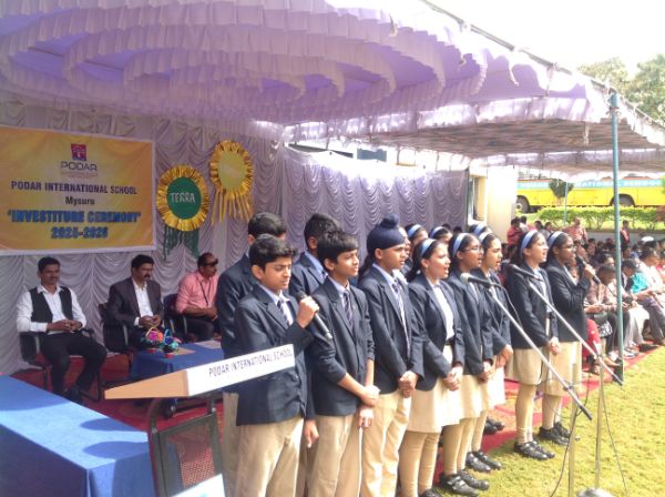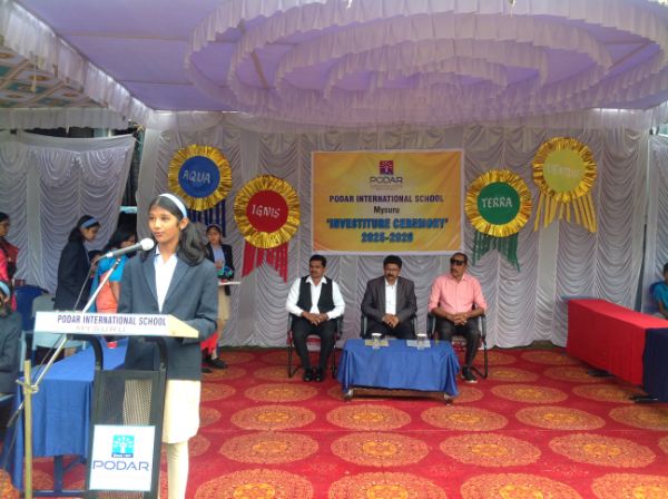 Investiture ceremony is an important occasion where a school entrusts its upcoming leaders with certain roles and responsibilities. Delegation of responsibility and giving authority to children is important as it teaches them lifelong skills of being powerful and caring at the same time. At Podar International School, Mysore, the newly nominated members of the school’s prefectorial team was inducted on 24th June 2023. The Chief Guest Col. Ashutosh Devrani graced the occasion and enlightened the students by emphasizing them to carry the duty with the sense of responsibility and dignity. The zeal of the council was reflected in their confidence and dedication to execute their work. The students amused the spectators with their outstanding performance of zumba dance, dumbbells drill and yoga display. The captains and the house members performed the march past spectacularly; the school band leading them. The principal Mr. Krishna Bangera appreciated and encouraged the students for their outstanding performance. He also stressed that at Podar we provide the platform for the students to explore the talents and pursue the career as per their interest.
