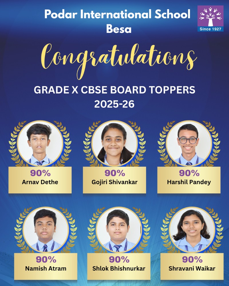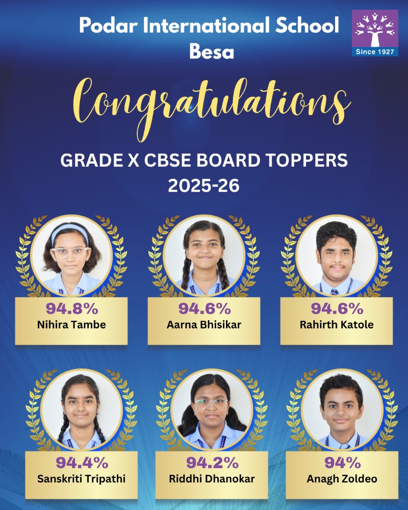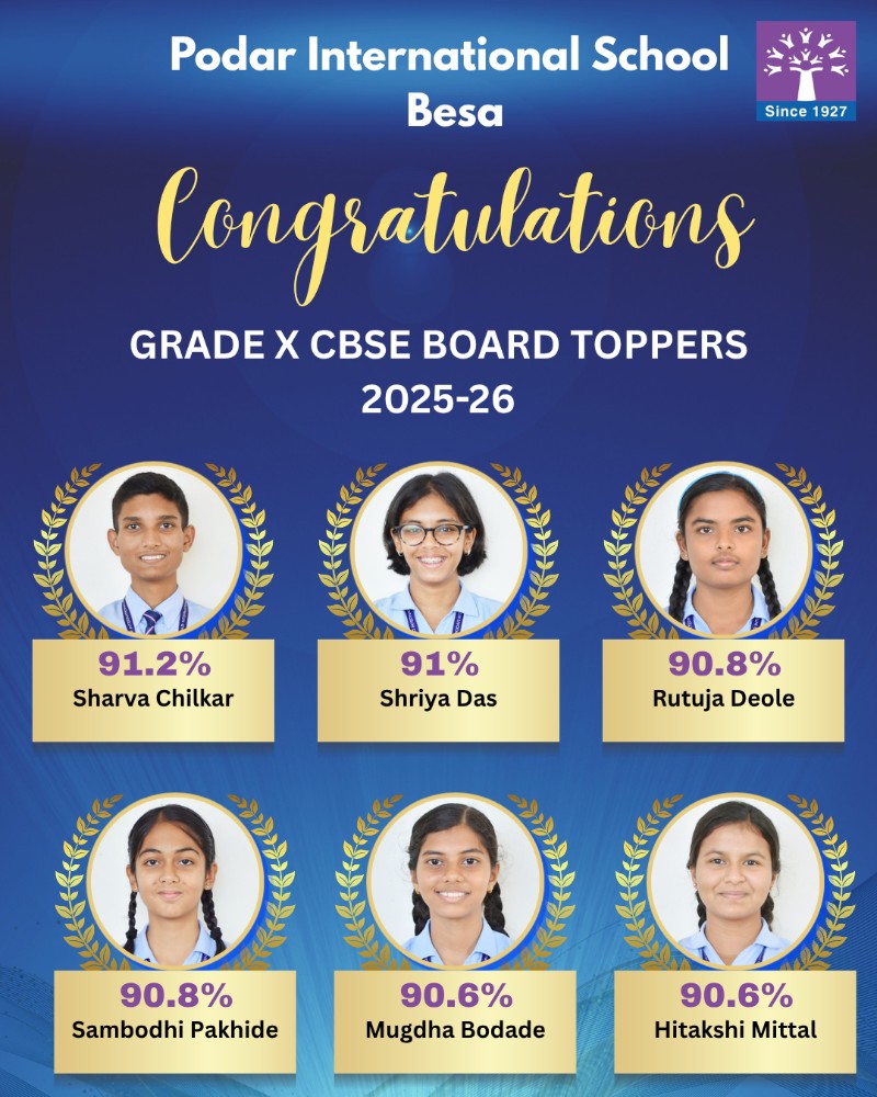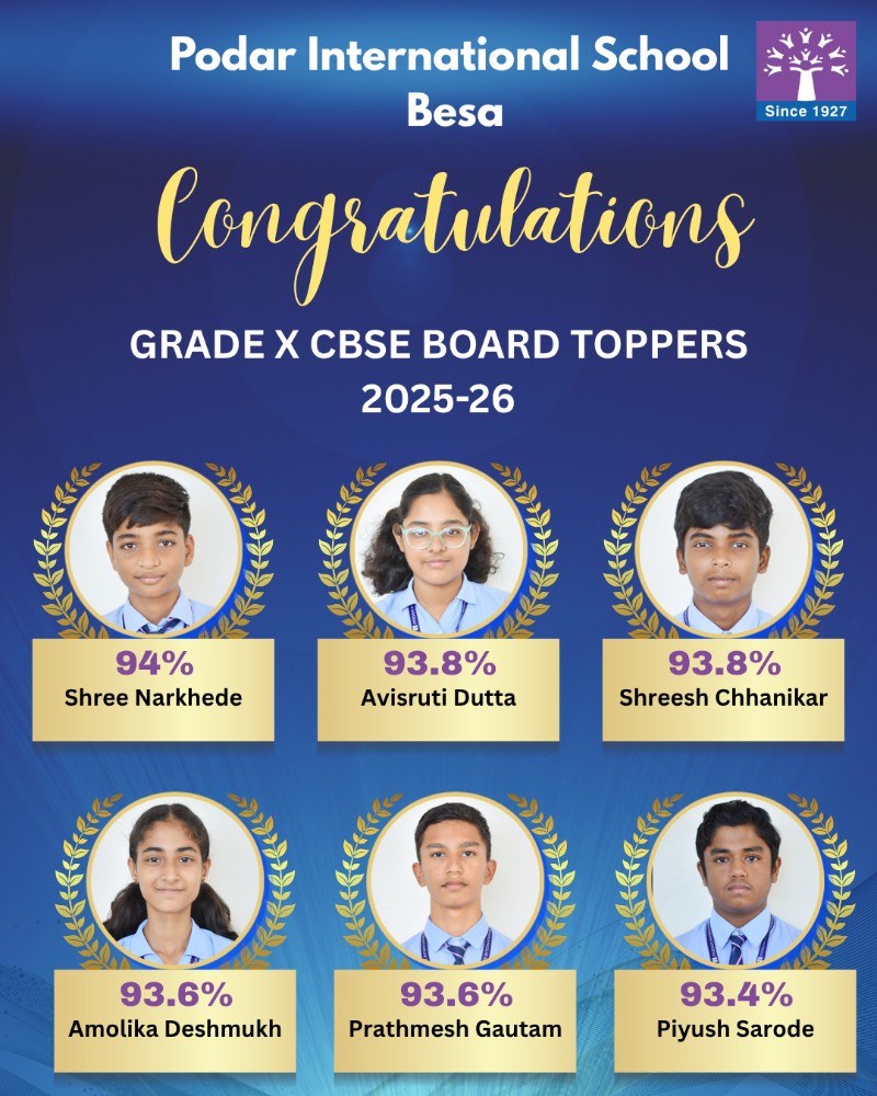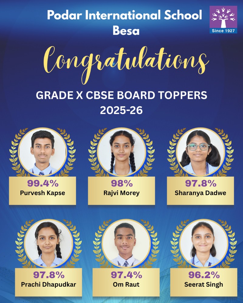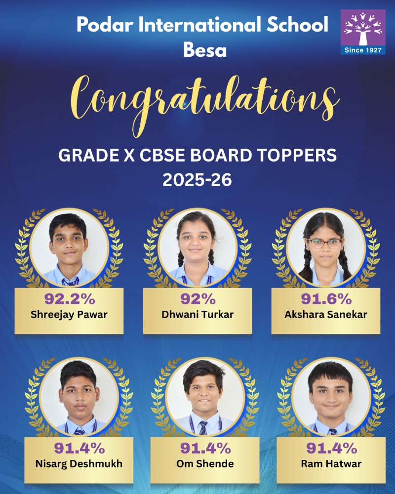 Podar International School Nagpur, Besa celebrates the outstanding success of its students in the CBSE Grade 10 Board Exams 2025–2026.