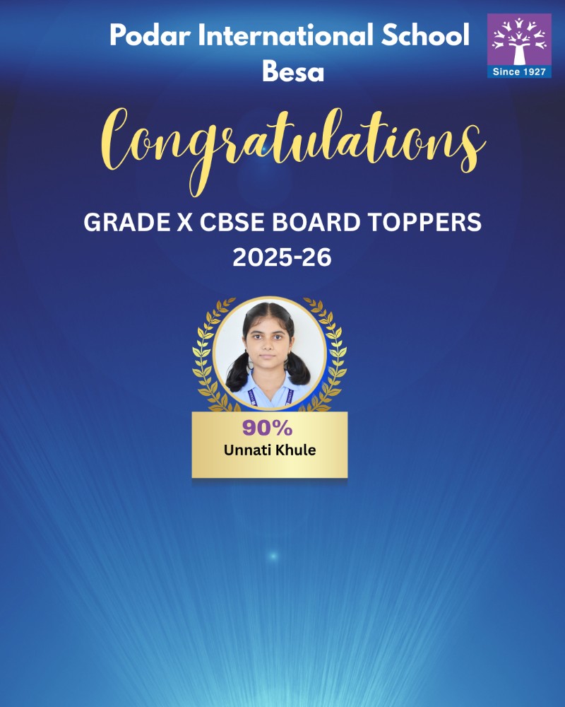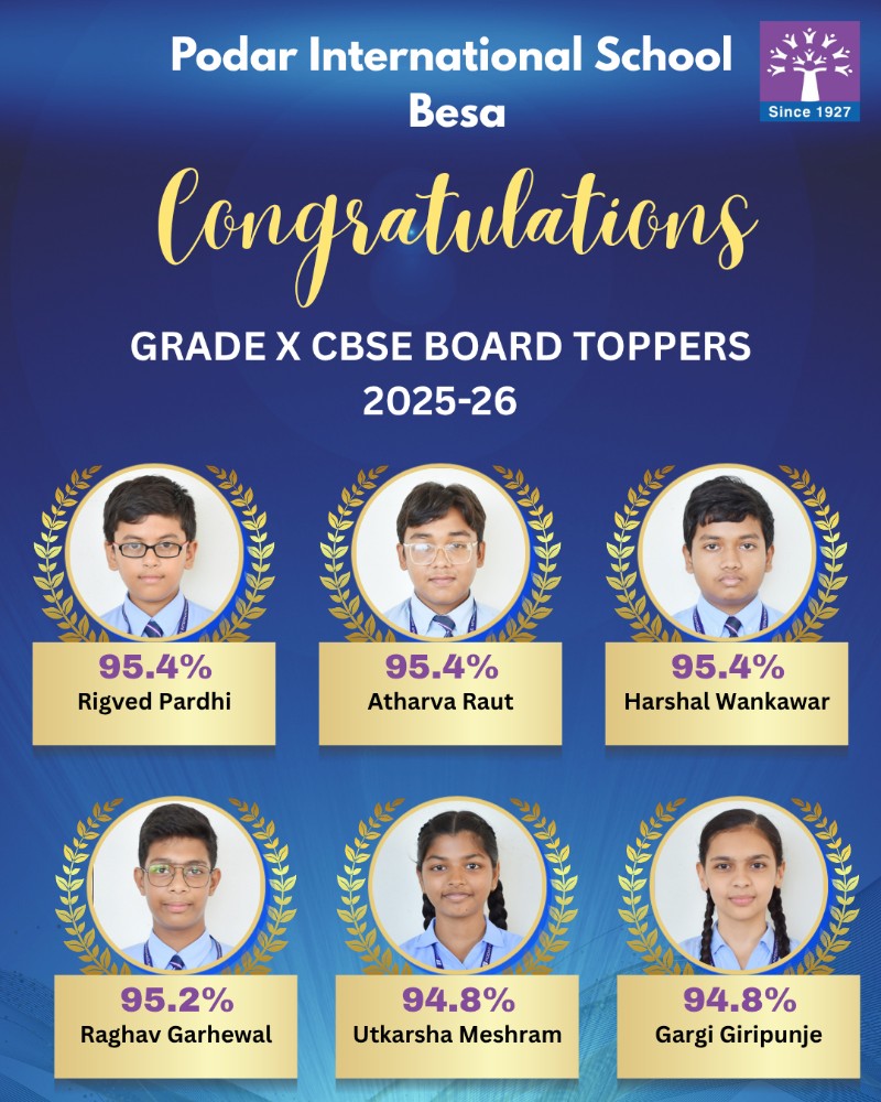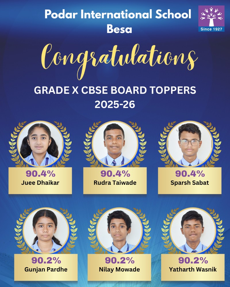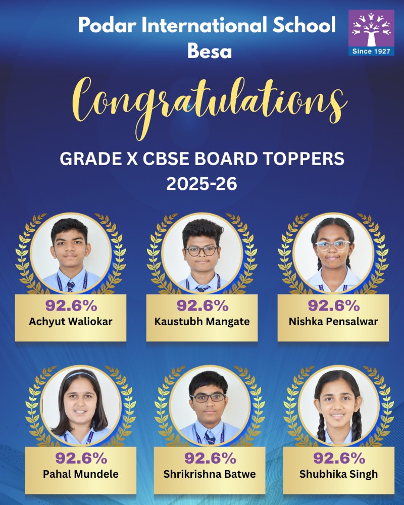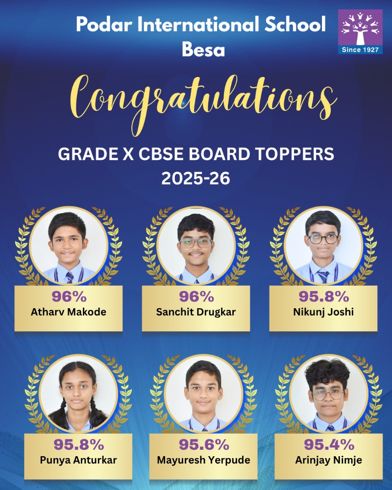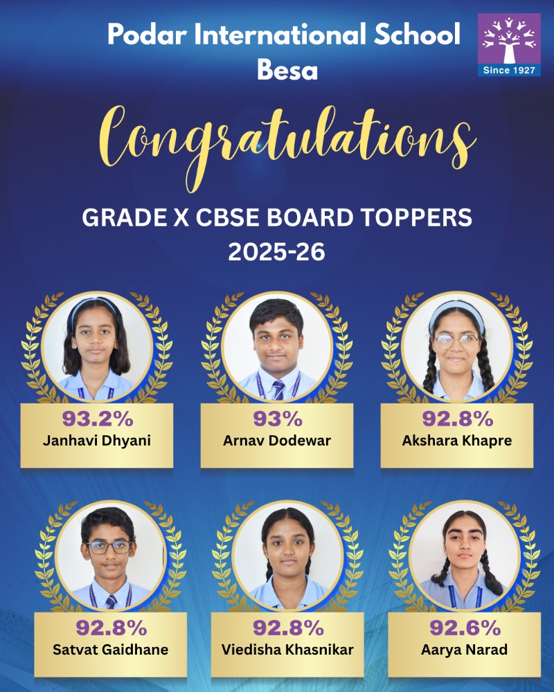 Podar International School Nagpur, Besa celebrates the outstanding success of its students in the CBSE Grade 10 Board Exams 2025–2026.