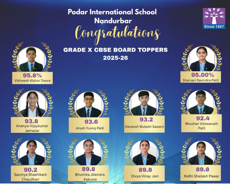 Podar International School Nandurbar celebrates the outstanding success of its students in the CBSE Grade 10 Board Exams 2025–2026.