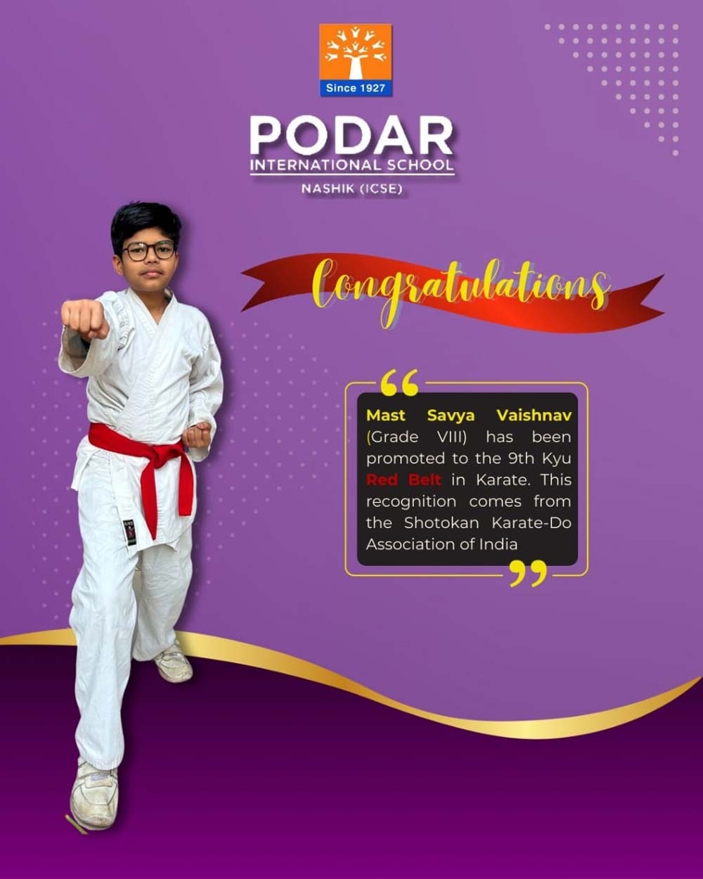 Mast. Savya Vaishnav (Grade 8th) has been promoted to the 9th Kyu (Red Belt) in Karate. This recognition comes from the Shotokan Karate-Do Association of India.