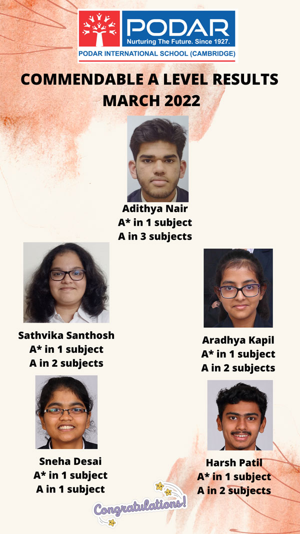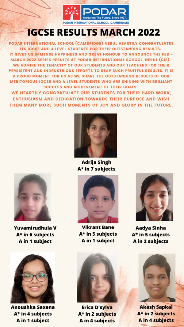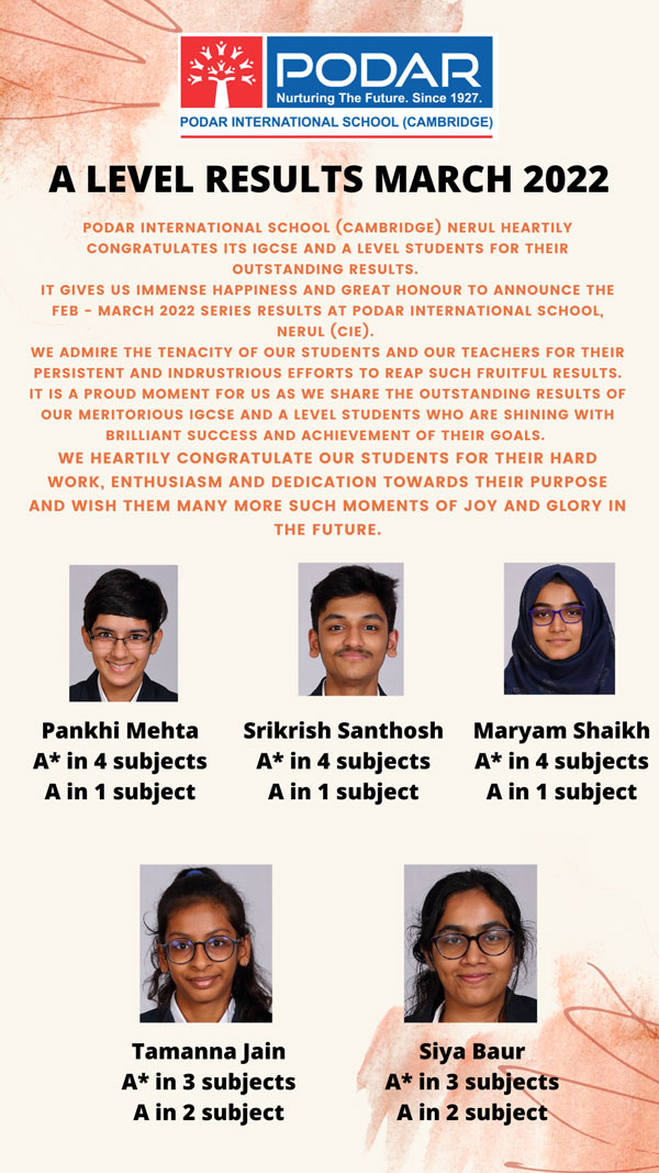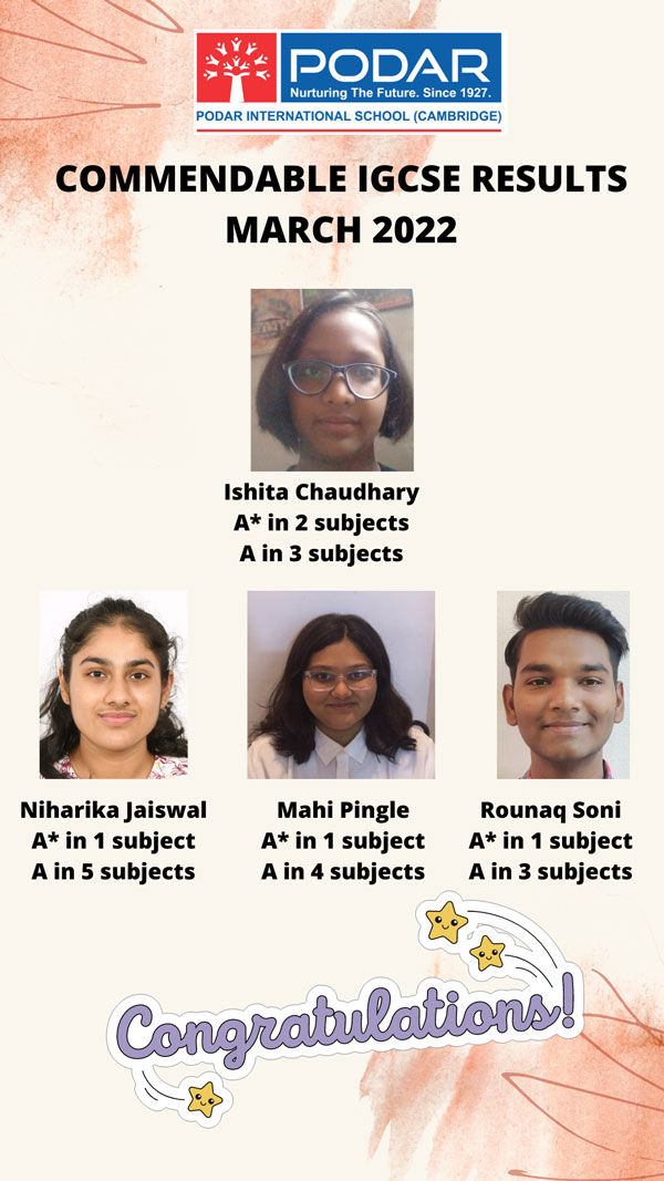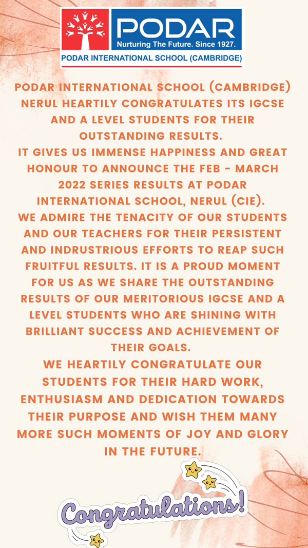 It gives us immense happiness and great honour to announce the March 2022 series results at Podar International School(Cambridge), Nerul.