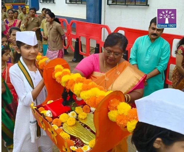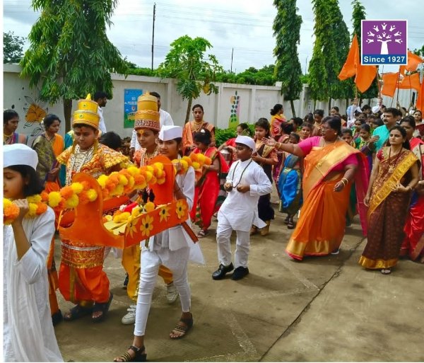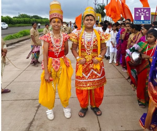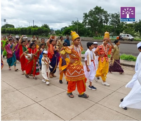 The celebration began with a vibrant procession featuring students dressed in traditional navwari sarees and dhoti-kurta attire, carrying the idol of Lord Vitthal and Rukmini in a beautifully decorated palki.