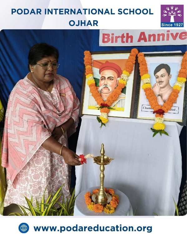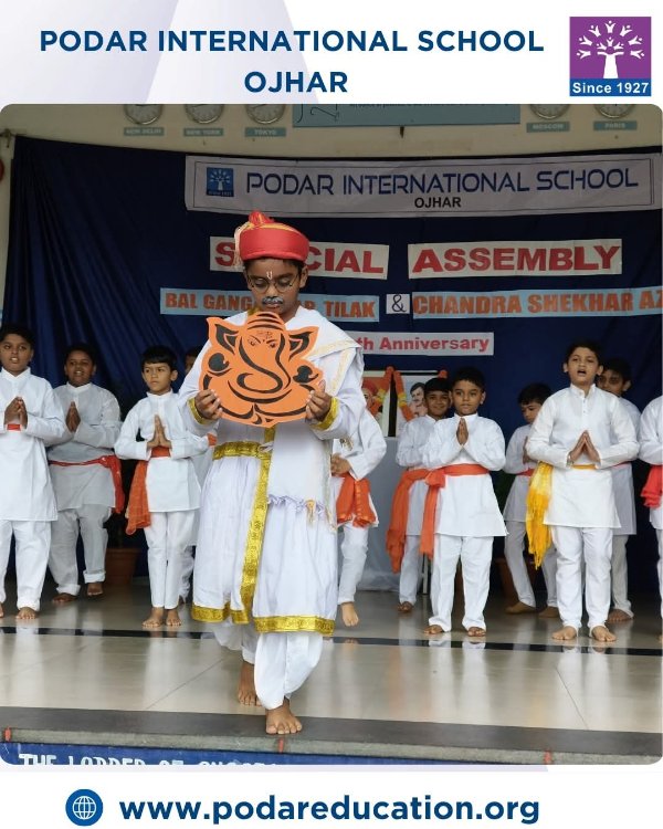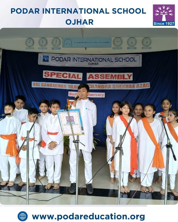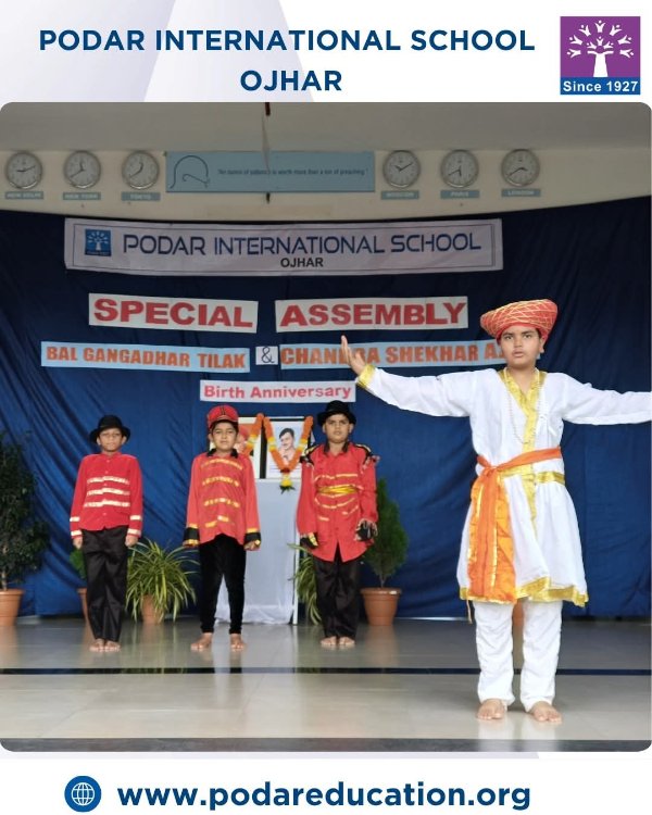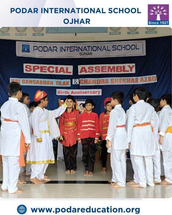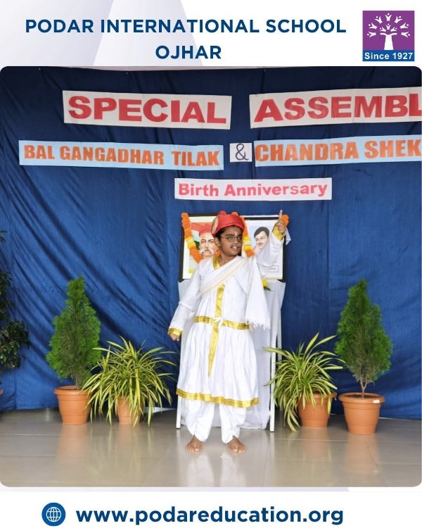 A special assembly was conducted on 23rd July 2025 in Podar International School #Ojhar by Grade IV Jasmine students to commemorate the birth anniversary of two legendary freedom fighters—Lokmanya Bal Gangadhar Tilak and Chandrashekhar Azad.