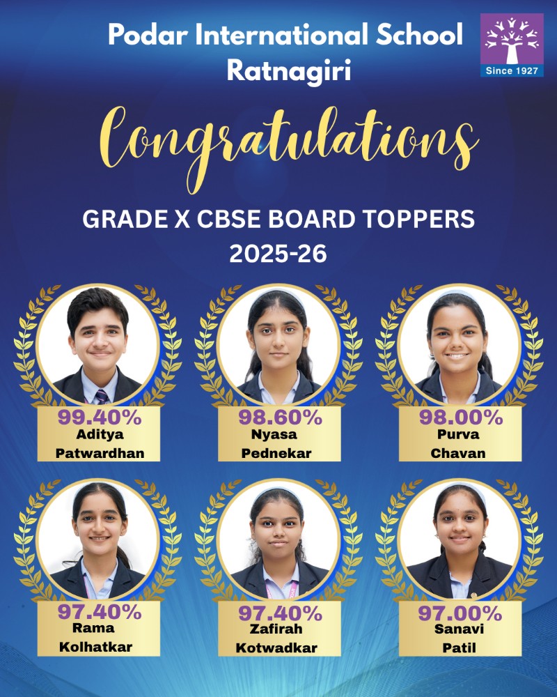 Podar International School Ratnagiri celebrates the outstanding success of its students in the CBSE Grade 10 Board Exams 2025–2026.