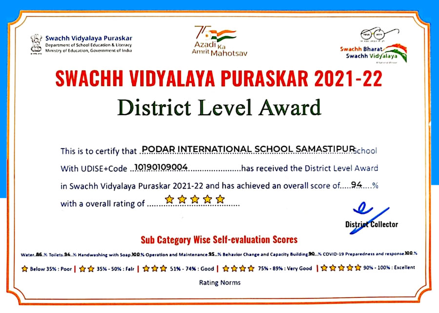 Podar International School Samastipur feels proud to announce that on a Cleanliness drive conducted at the District Level, our school has been awarded with the Swachh Vidyalaya Puruskar for the Academic Year 2021-22.