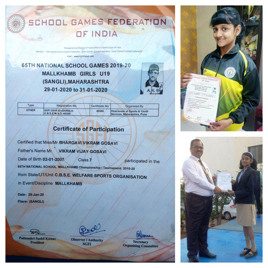 Miss Bhargavi Gosavi Represented Podar School for School Games Federation of India organised by Central Sports Ministry of India for Malakhamb under 19 Years category. She stood 5th in India and made her School name Proud. She will represent Indian Team for International Malakhamb Championship.