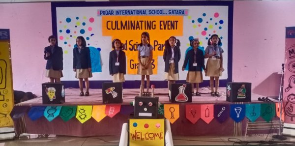 The students of Grade III enthusiastically presented their culminating event titled “Magical Science Lab” in the School Auditorium. The program was a wonderful celebration of curiosity, creativity, and scientific learning. The event was graced by our respected Principal, Vice Principal, teachers whose presence added great encouragement to the young learners. To create a lively atmosphere, the event commenced with a melodious musical performance by the talented students, setting the perfect tone for the scientific journey ahead.