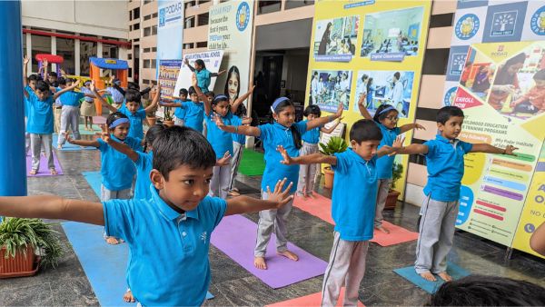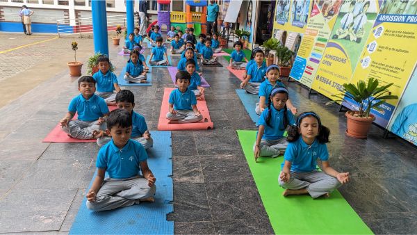 The school staff and all the students immersed in different yoga asanas. They all experience more centeredness and distress.