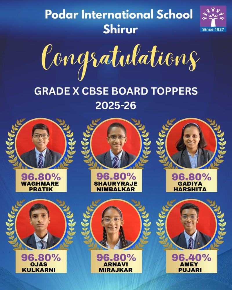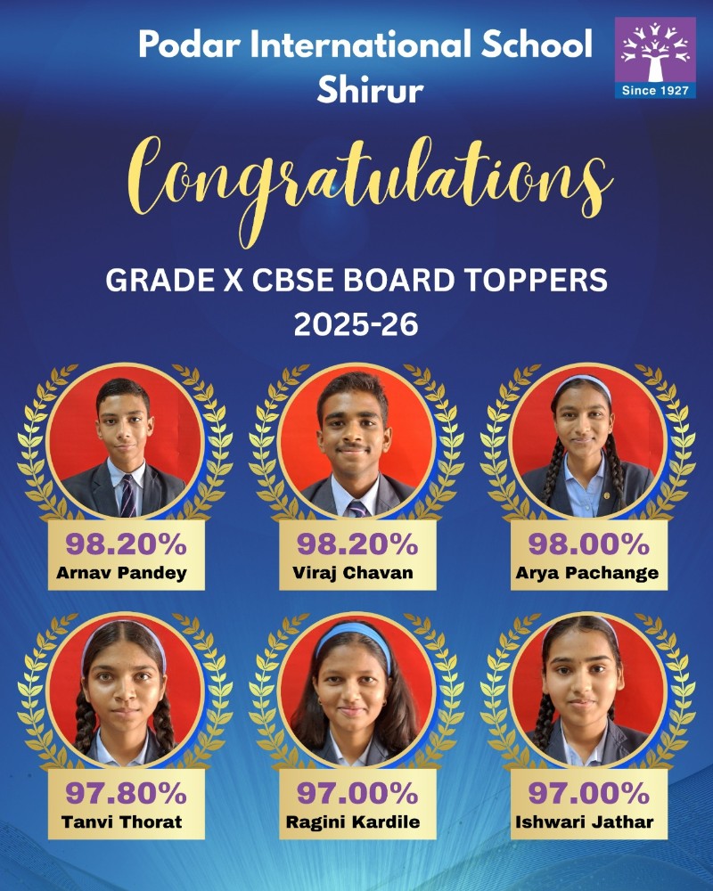 Podar International School Shirur celebrates the outstanding success of its students in the CBSE Grade 10 Board Exams 2025–2026.