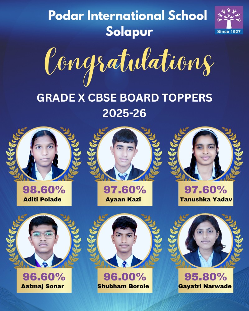 Podar International School Solapur celebrates the outstanding success of its students in the CBSE Grade 10 Board Exams 2025–2026.