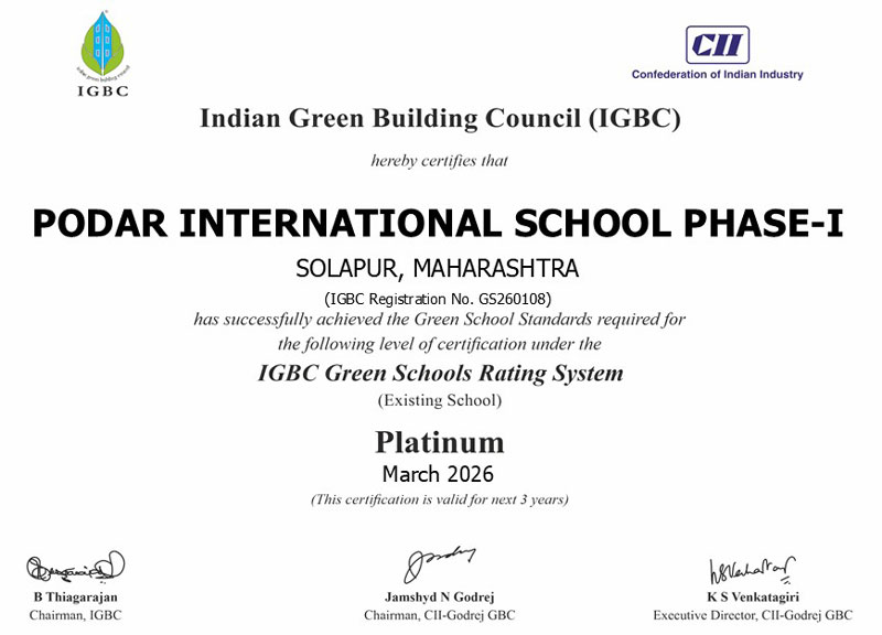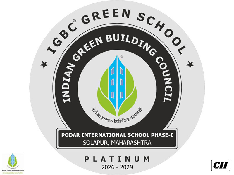 Podar International School – Solapur, of Podar Education and Sports Network Mumbai, has been awarded with the highest "Platinum" rating under the Indian Green Building Council’s (IGBC) Green Schools’ category for the existing School Building. This recognition given under the aegis of the Confederation of Indian Industry (CII), is a landmark achievement that highlights the school’s commitment to sustainability and global leadership in environmental stewardship.