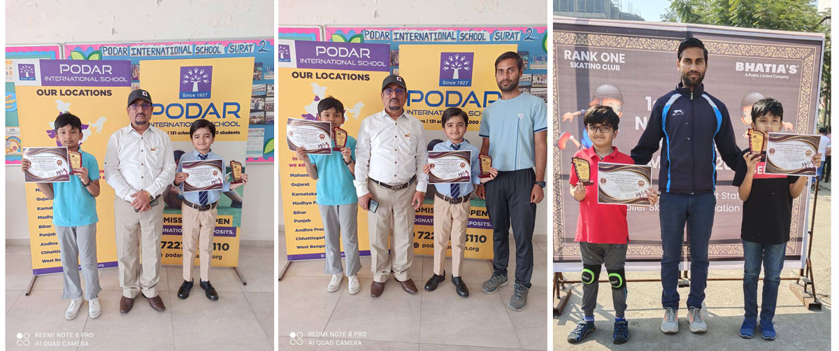 Podar International School, Jahangirabad #Surat2 is proud to share with you all that our students Master Naksh Patel and Master Jaison Paradkar participated in 1st Non - Stop Skating Championship, 2022 conducted by Rank One Skating Club at Bhagwan Mahavir College, Vesu, Surat and won trophies along with certificates and prizes and brought laurels to the school.