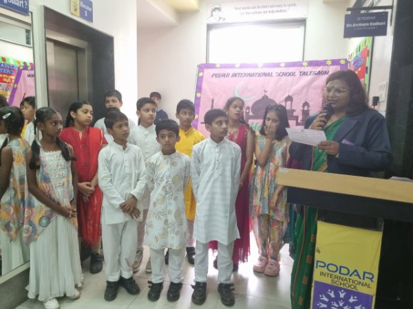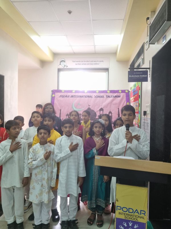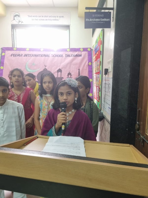 Eid marks the culmination of Ramadan, a month of fasting, prayer, reflection, and community spirit for Muslims worldwide. A special Assembly commenced at Podar International School #Talegaon with the opening remarks, emphasizing the importance of Eid and its universal message of compassion, gratitude, and unity. The speech presented by the student of grade 9, highlighted the diversity within our community and underscored the significance of embracing different cultural traditions to promote harmony and mutual respect.