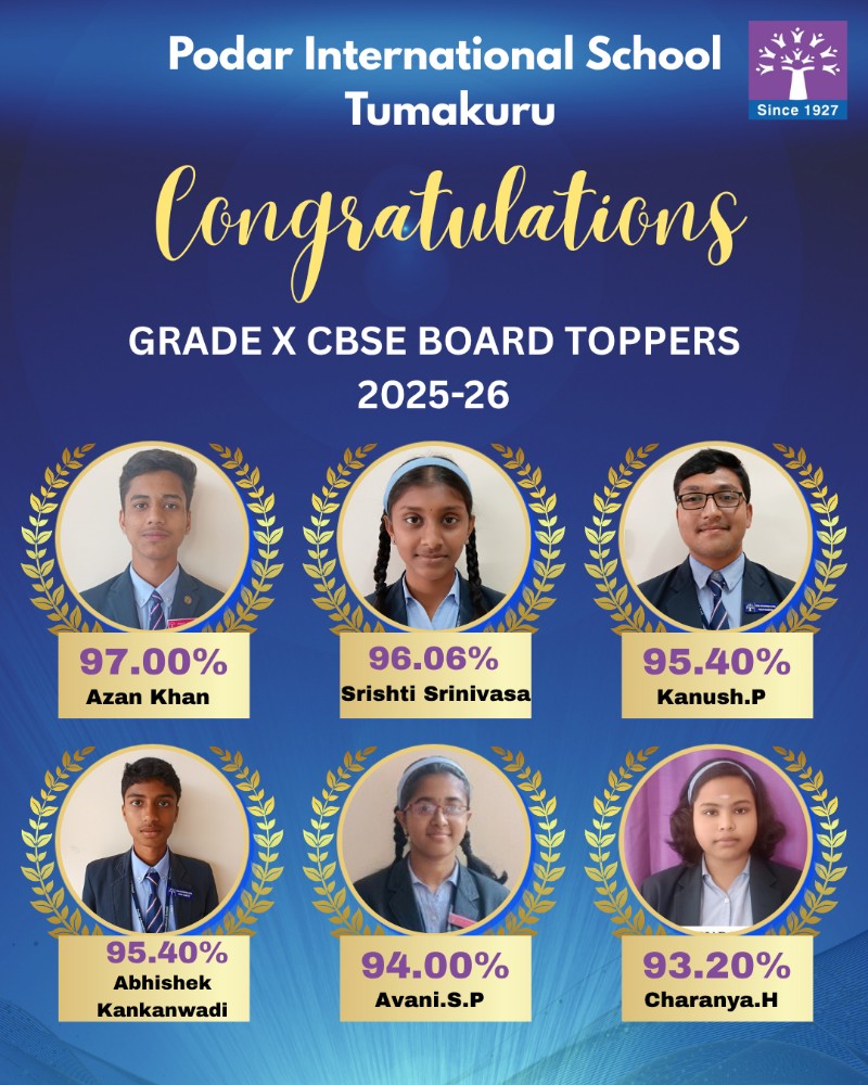 Podar International School Tumakuru celebrates the outstanding success of its students in the CBSE Grade 10 Board Exams 2025–2026.