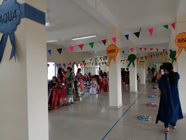 To celebrate this day, a beautiful village was created on the school grounds, where our students presented an informative act. They discussed the problems faced by the local people in rural areas with a group of panchayat heads, who then provided solutions. This act illustrated the workings of Panchayati Raj to the students.