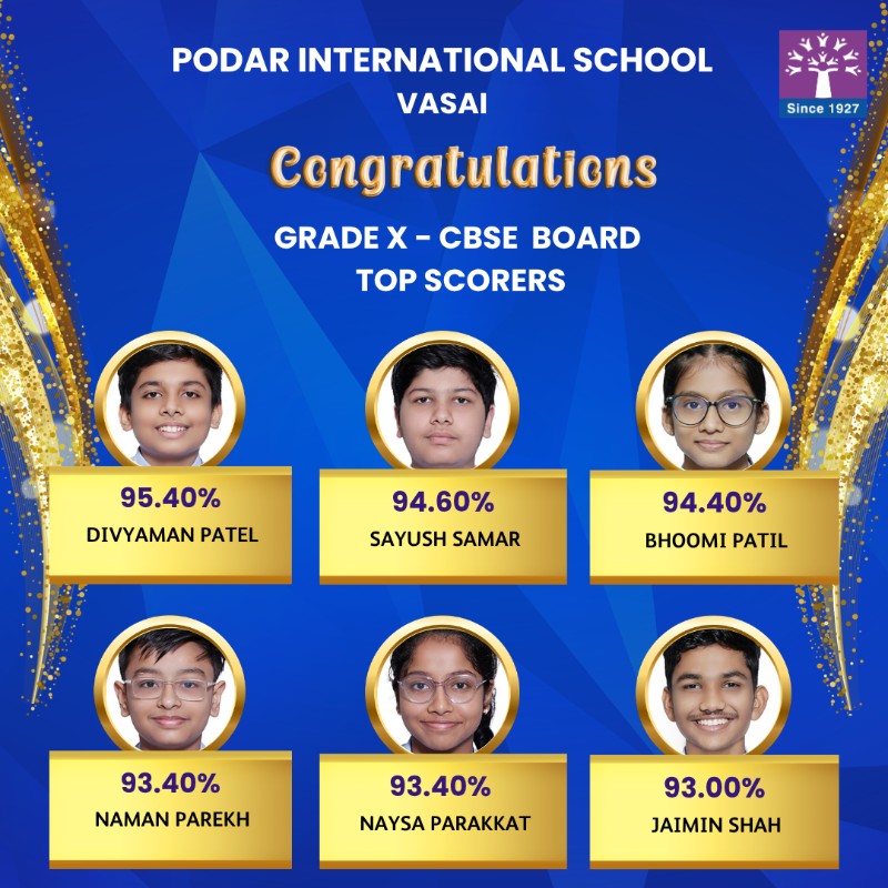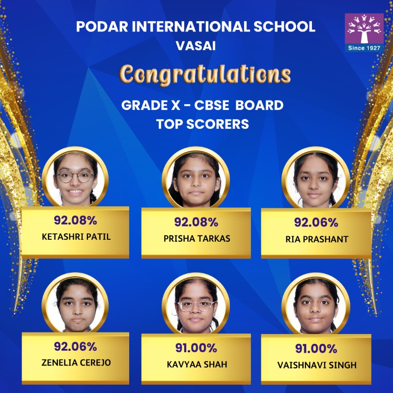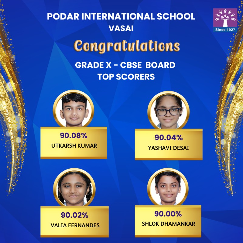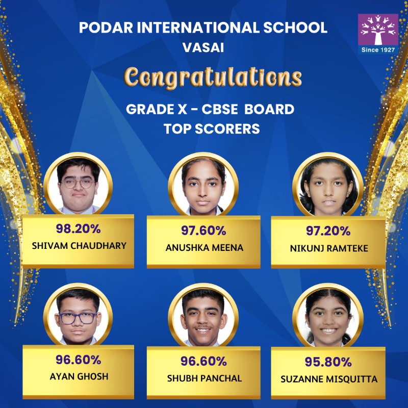 Podar International School Vasai celebrates the outstanding success of its students in the CBSE Grade 10 Board Exams 2025–2026.